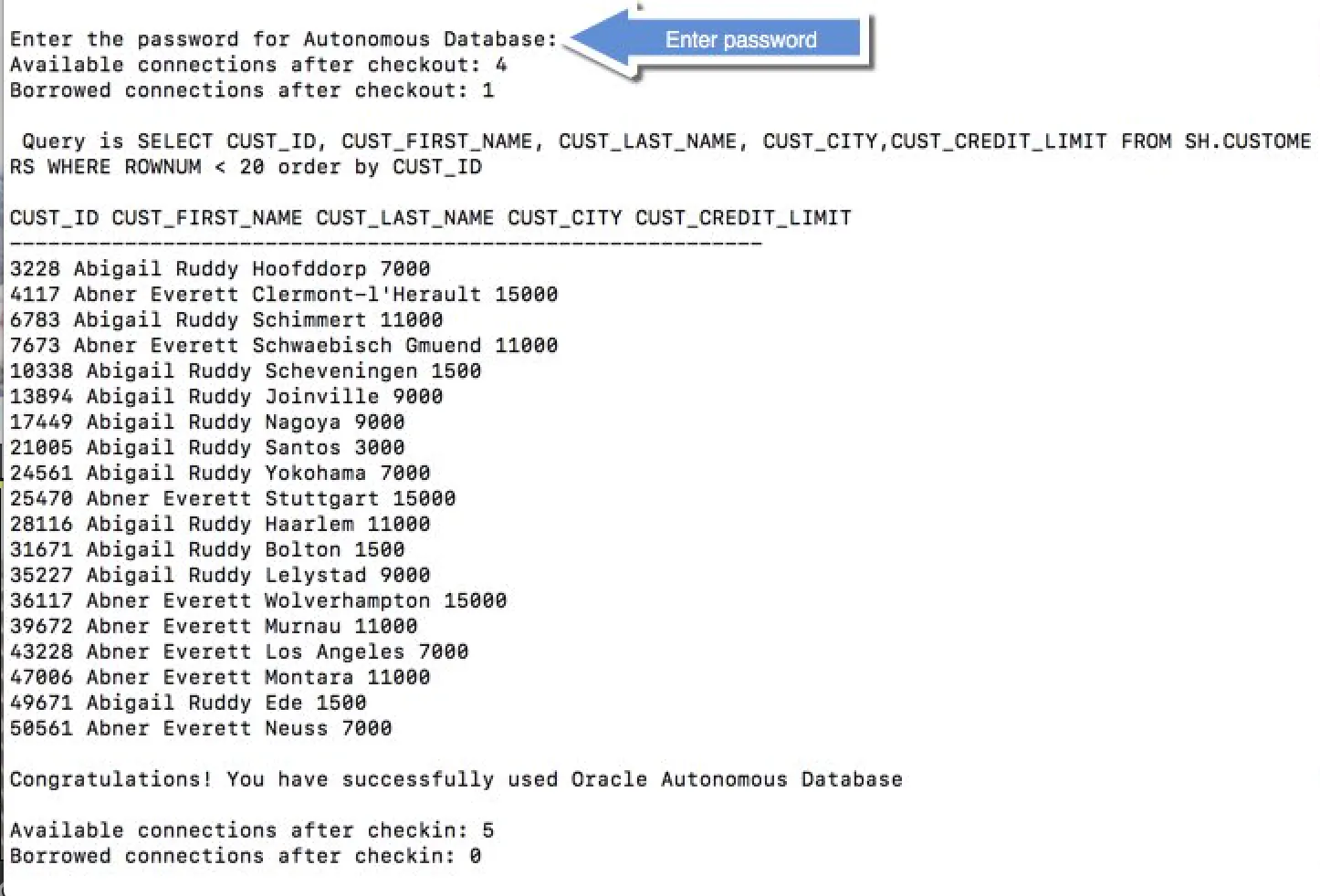 You will see the queried rows returned from the database and a message Congratulations! You have successfully used Oracle Autonomous Database as shown in the screenshot below. Note: If you connect to ADB from behind a firewall, you will likely encounter a connection timeout error. Make sure to be outside the firewall while running this sample or update the tnsnames.ora file to use an HTTPS proxy. Learn how to do this in "JDBC Thin Connections with an HTTP Proxy" section of the ADB documentation.