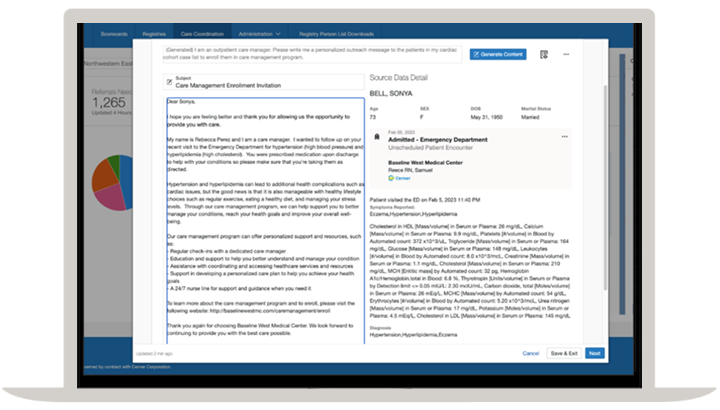 Oracle Health Care Management aims to empower patients to better care for their own health with the help of personalized resources and tools, such as care manager support and tailored care plans. Oracle Health Care Management can help achieve higher patient engagement and better adherence to care plans. The solution uses generative AI to create highly personalized, hypercontextual, and empathetic outreach messages by summarizing patient longitudinal health records and social determinants of health. Oracle Health Care Management is a secure and reliable solution that’s readily available for care teams to use in the EHR, patient portal, or anywhere they operate. Generative AI in care management helps reduce the administrative task burden on care managers and allows them to spend more time focusing on their patients. Oracle Health Care Management, when used by care managers across the healthcare industry, can help ultimately improve patient care decisions, with the goal of lowering the likelihood of patient readmission and improving preventive health.