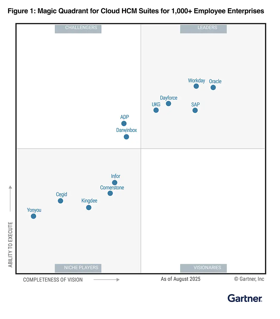 * Gartner, Magic Quadrant for Cloud HCM Suites for 1,000+ Employee Enterprises, Josie Xing, Ranadip Chandra, Sam Grinter, Ron Hanscome, Harsh Kundulli, David Bobo, Chris Pang, Anand Chouksey, Laura Gardiner, Jackie Watrous, Stephanie Clement, Michelle Shapiro, Chris Hester, Jeff Freyermuth, 8 September 2025.