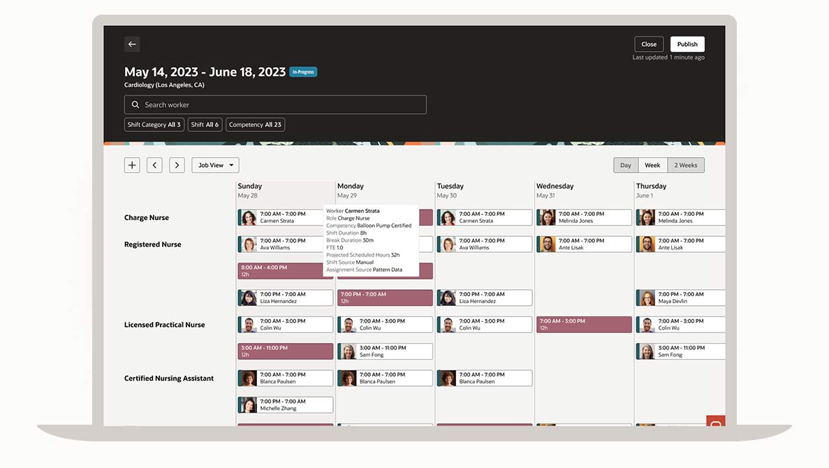 Oracle Workforce Scheduling and Oracle Workforce Labor Optimization skillfully balances patient needs, compliance, and the employee experience by connecting business data in one native cloud scheduling solution.