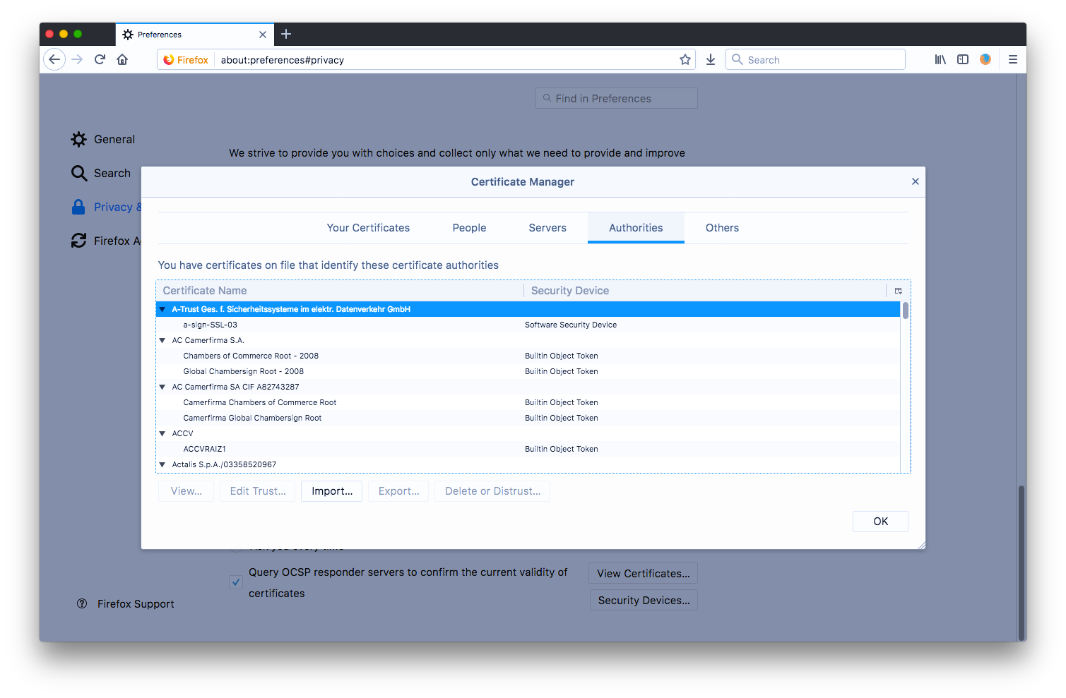 You can see what Certificate Authorities are included in your browsers. For example, in Firefox on macOS you can type “about:preferences#privacy” into the address bar (on Windows use "about:preferences#advanced") and scroll to the bottom where you will find the “Certificates” section. You can choose to view the complete list of trusted CAs’ certificates and see the details of what is in each certificate.