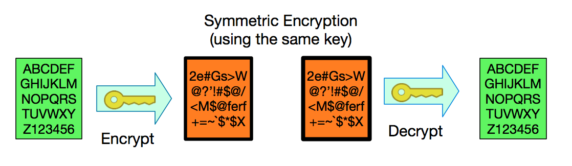 In our encryption example above we shifted letters “3 spaces”. The same value/key that we used for encrypting is used for decrypting. If you shifted 3 spaces to the right for encrypting, just shift 3 to the left for decrypting. This type of encryption, where the same key is used for encrypting and decrypting, is called symmetric encryption and has the benefit of being fast and taking relatively few resources to compute. Symmetric encryption has the drawback that you have to share the key used for encrypting with everyone authorized to decrypt.