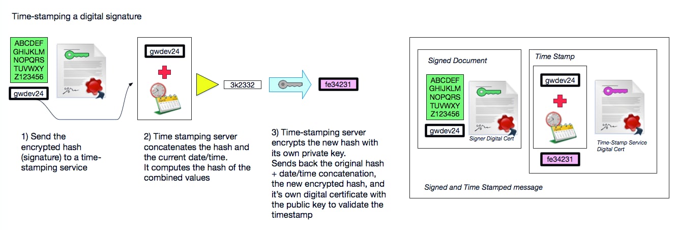 [12] Note that the time-stamping service only receives a hash, not the complete document, not even the complete signature that is being time-stamped. It time-stamps “whatever hash you pass” regardless of whether it’s really a hash for a signature or a random set of characters. It doesn’t know or care.