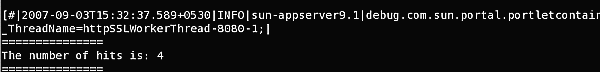 The number of times the sample portlet has been accessed is logged using a filter. Access the portlet and check the application server log file. The log file shows the number of times the portlet has been accessed.
