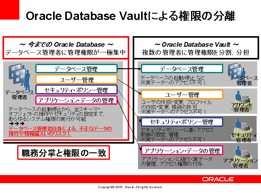 従来SYS、SYSTEMなどのDBAユーザーとそのパスワードがシステム部門の運用現場などでは複数の人で共有されているケースが多かった。しかしこの状態では実際の業務内容以上に過大な権限を保有する人が増え、内部情報漏えいを引き起こす温床になる。また万一事件・事故が起きた場合に誰が操作をしたのか特定できなくなるという問題もある。