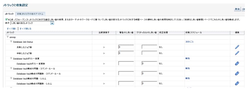 EMのデフォルトの監視設定はオラクル社によって設定されています。問題が無ければデフォルトのまま運用してもいくのも良いのですが、現行の監視設定(頻度、しきい値など)を踏襲したい場合もあるかと思います。EMではそれぞれのメトリックに対してしきい値と収集スケジュールが設定されています。以下でそれぞれどのように操作するかを説明します。