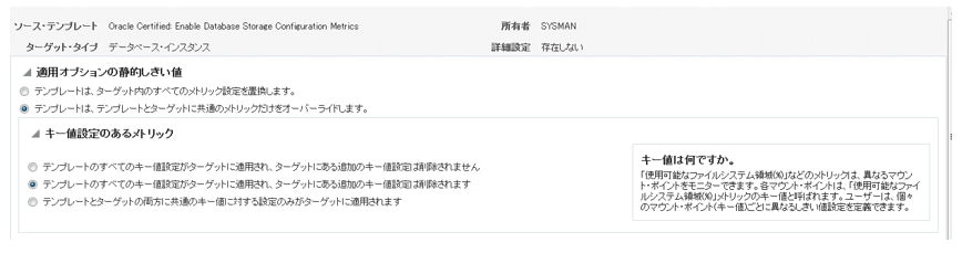 完全に同一なメトリック設定を適用する場合、「すべてのメトリック設定を置換する」を選択するか、「テンプレートとターゲットに共有のメトリックだけをオーバーライドします」を選択する必要があります。前者はすべてのメトリック設定を置き換えてしまうため、環境固有で設定すべきメトリック情報が上書きされてしまいます。例えば非Exadata環境のホストのモニタリング・テンプレートをExadata環境に設定すると、設定されるべきExadata固有のメトリックが設定されません。後者はテンプレートとターゲット間で共通しているメトリックだけの置換となるため、範囲を狭めることが出来ます。先ほどのExadataの例だと、共通しているホストのメトリックのみが置き換わるため、デフォルトで設定されているExadataのメトリックには影響がありません。
