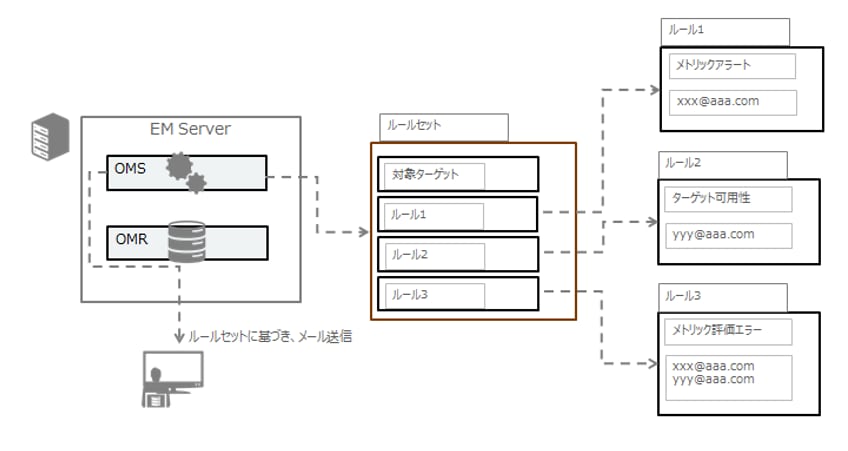 ルール・セットとは、OMSで管理するターゲットに対応する1つ以上のルールをまとめた定義です。ルールとは、特定のイベント・問題・インシデントに対応するアクション定義であり、管理者へのアラート送信先や方法もルール内で定義します。管理者へのアラート通知は上記ルールに基づき、OMSを経由して各宛先アドレスへ送信されます。通知方法としてメール送信だけでなく、SNMPトラップやコマンドを指定することも可能です。