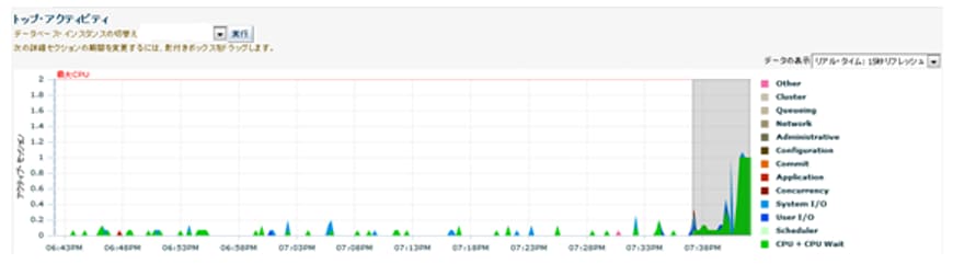 性能劣化や障害が発生したときは、EMでトップ・アクティビティ画面を見ることをオススメします。トップ・アクティビティ画面ではASHを自動でグラフ化してくれるため、どういったSQLが実行され、それぞれどういった待機イベントで待機しているかがグラフィカルに表示されます。例えば上図の場合、緑色のグラフが19時40分頃から大きくなっていることが見えます。緑色はCPUの待機イベントであるため、CPU待機による遅延が発生していることがわかります。