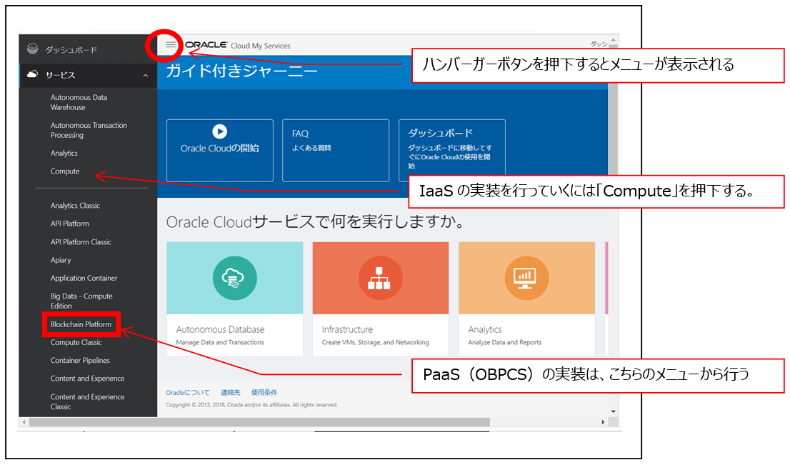 しばらくの間Computeでの操作が多かったかと思います。PaaSの実装を行う際にはOracle Cloud 管理コンソール直下からの操作になりますので、再度確認するところから始めたいと思います。