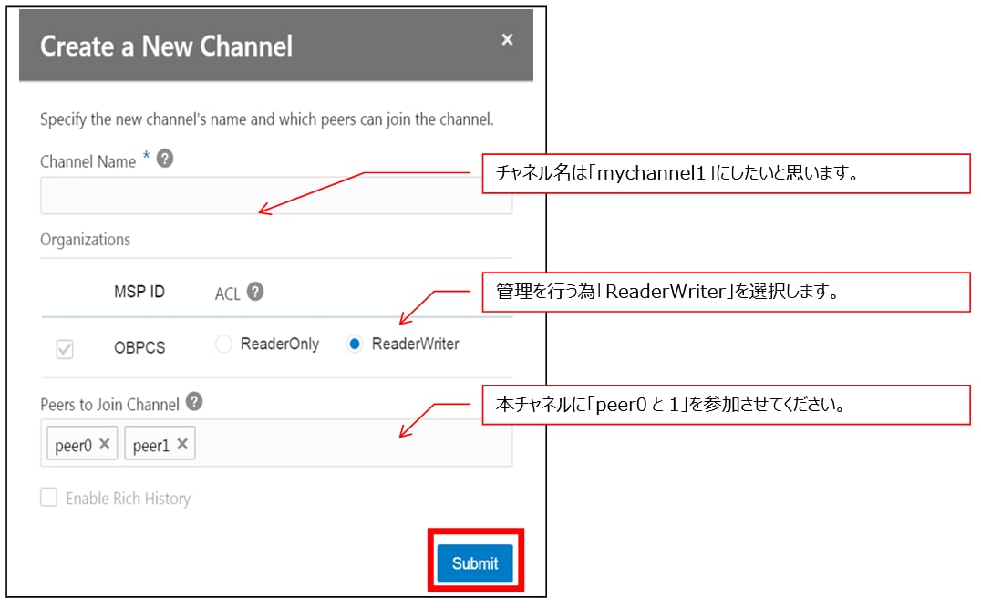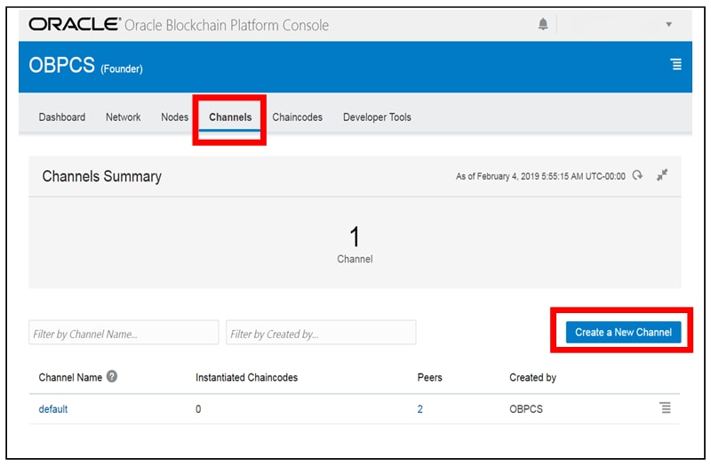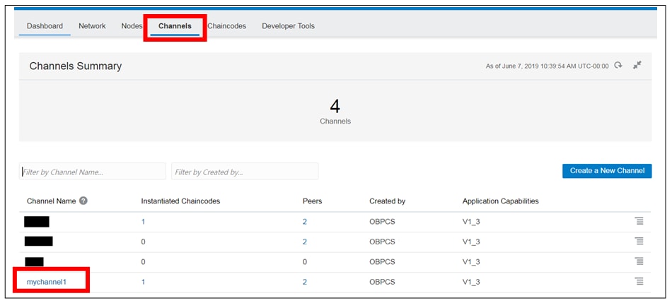 Oracle Blockchain Platform Consoleにて「Channels」を選択し、