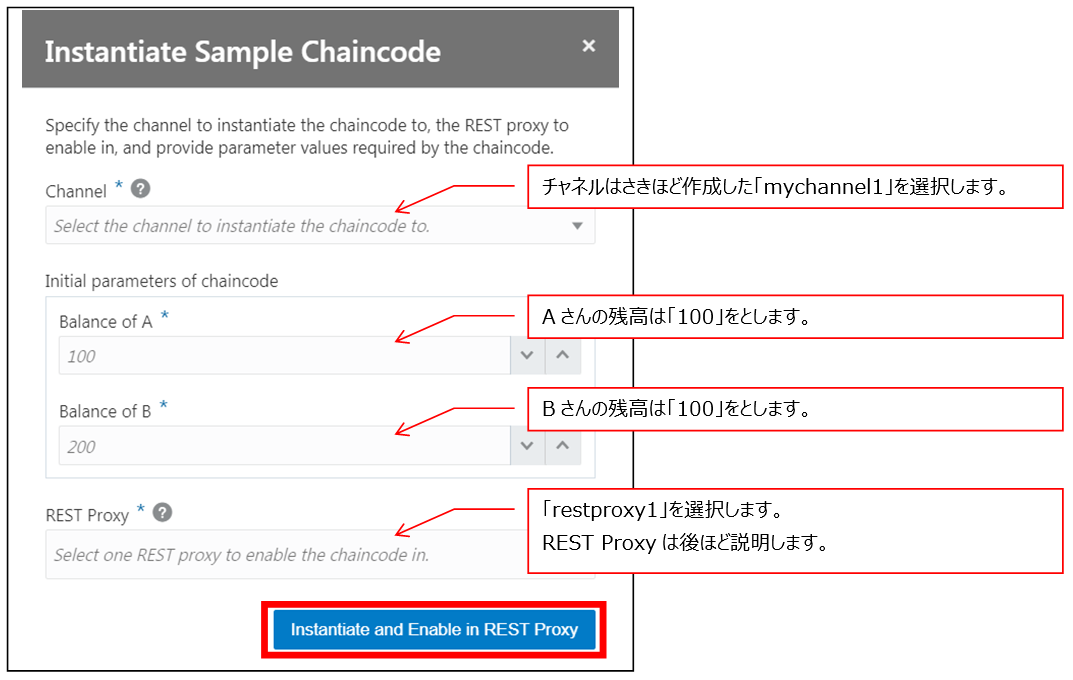 Installed on peersが「2」になったことを確認したら「Instantiate」を押下してインスタンス化したいと思います。