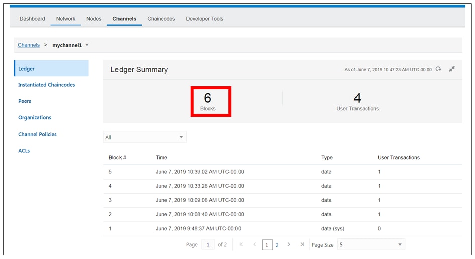 ブロックチェーンの情報を見てみたいと思います。チャネルごとに台帳が管理されていますので、
