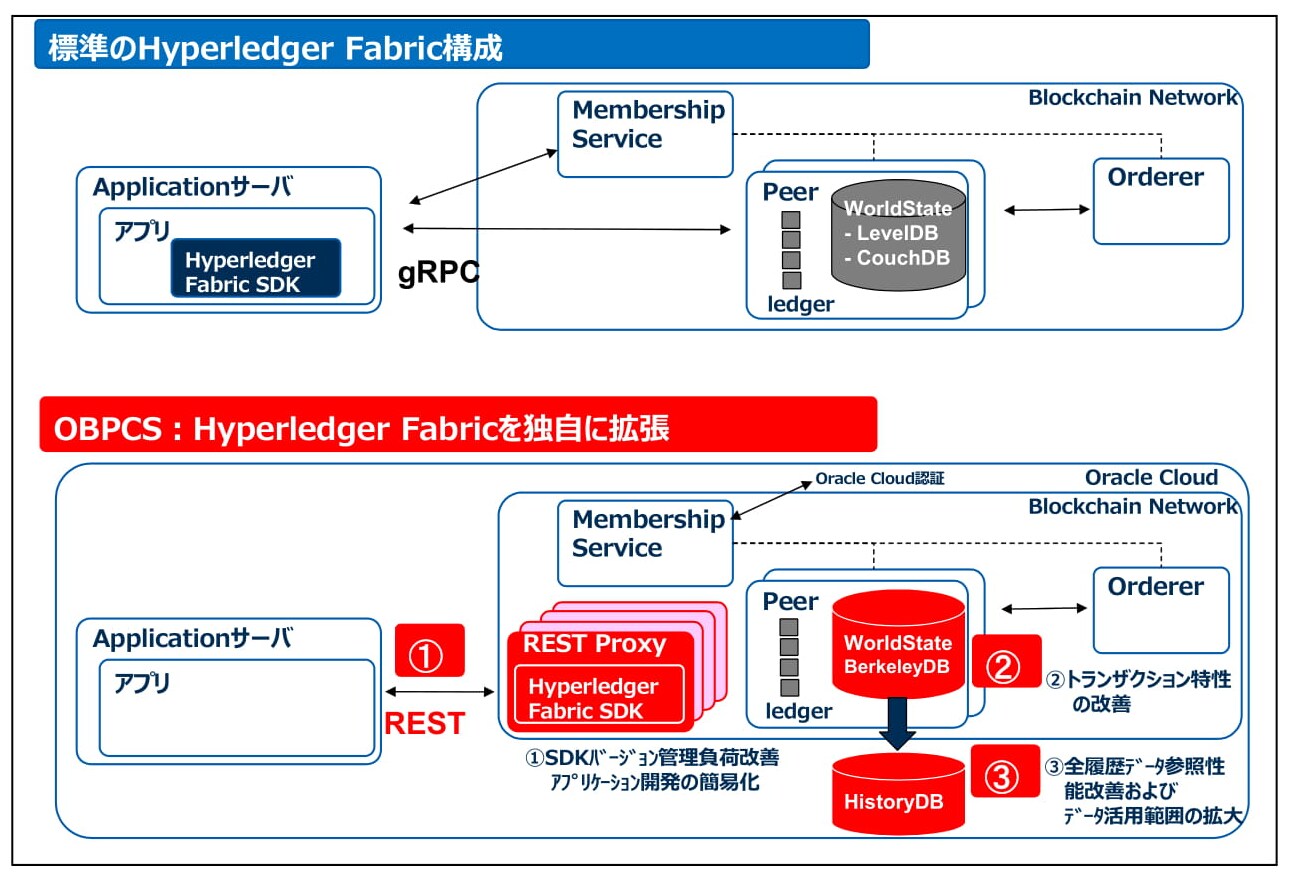 Oracle Blockchain Platform Cloud Serviceは標準のHyperledger Fabricとの最も大きな相違点の1つとしてREST Proxyが挙げられます。REST ProxyはHyperledger Fabric SDKを内包しています。標準のHyperledger Fabric構成でのクライアントアプリはHyperledger Fabric SDKベースで作成し、gRPCによる通信を行うことになります。この点は非常に学習コストが高いと考えます。一方のOracle Blockchain Platform Cloud Serviceは、標準的なRESTアプリを用いることができます。デバッグに要する時間なども考えると圧倒的に効率的です。