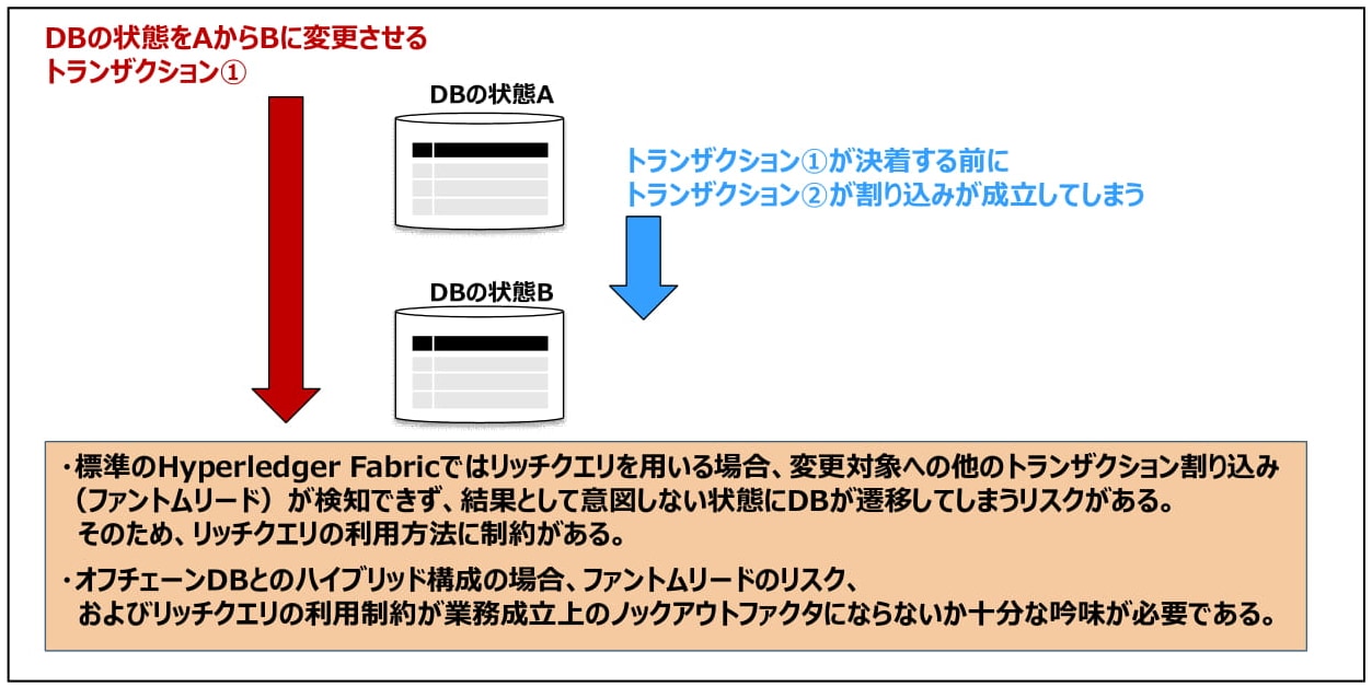 | 標準のHyperledger Fabric | 検証結果:ファントムリードの発生を検知できず、意図しない状態となってしまった |