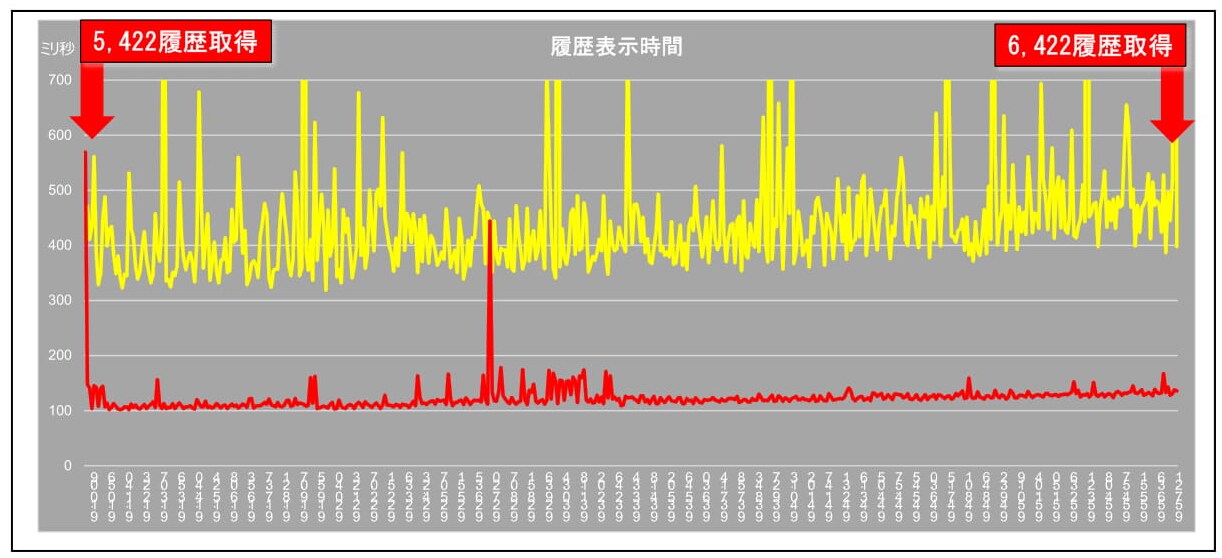 性能評価の結果を記載しますが、測定の条件やアプリケーションの作りで結果は大きく異なります。ですので、 あくまで参考情報としてお読みください。ここでお伝えしたいのはブロックチェーンの特性としてチェーンされたブロックを遡る行為がチェーンの長さに依存して性能劣化していくことと、Oracle Blockchain Platform Cloud Serviceが持つその事象への対策機能であるRich History Databaseの効果です。