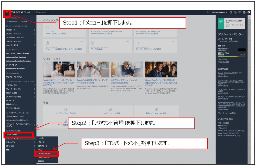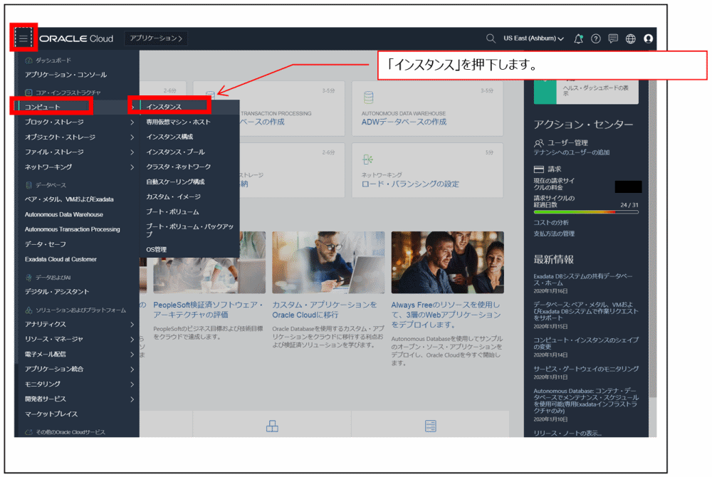 これからOracle Cloud管理コンソールを活用して実装をしていきます。ハンバーガーボタンを押下するとメニューが表示されます。表示されたメニューで構築を進めて行きます。