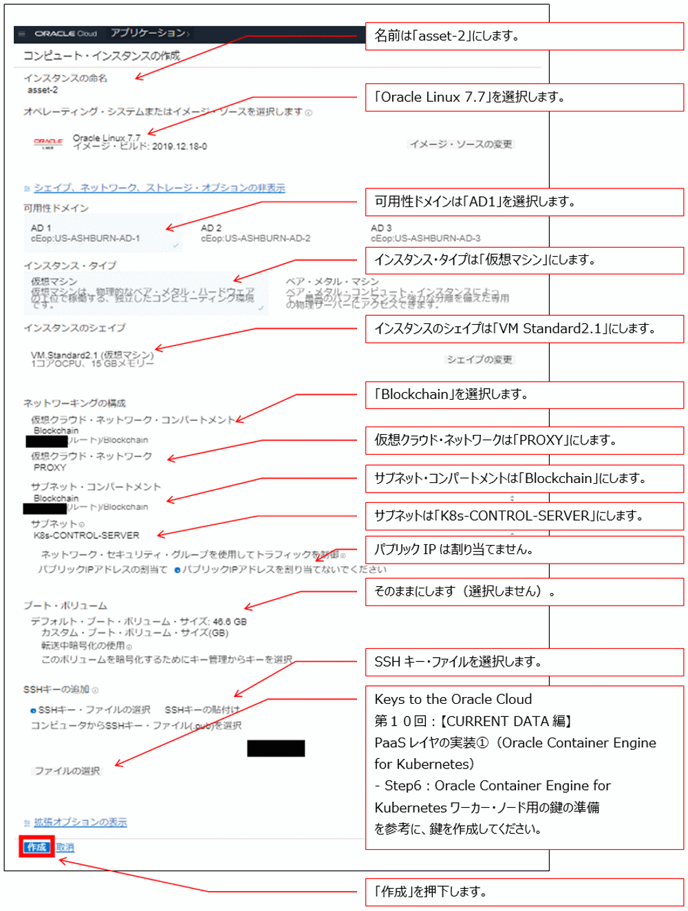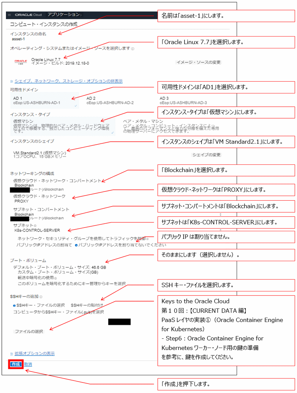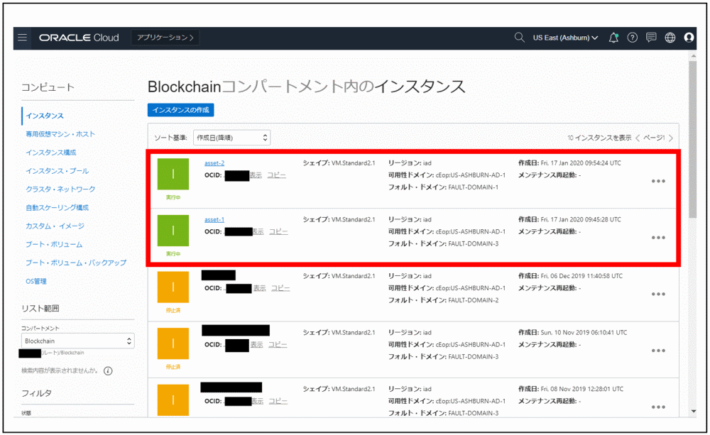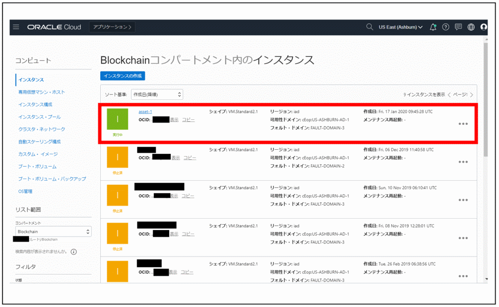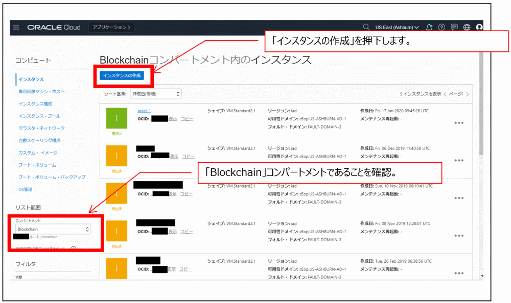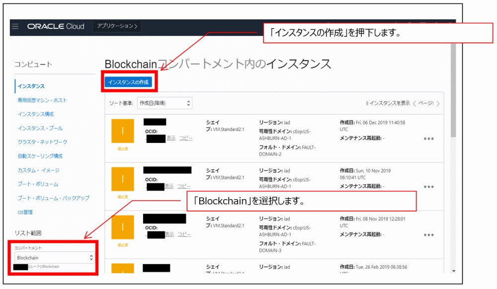 「Blockchain」コンパートメントであることを確認の上、「インスタンスの作成」を押下して、