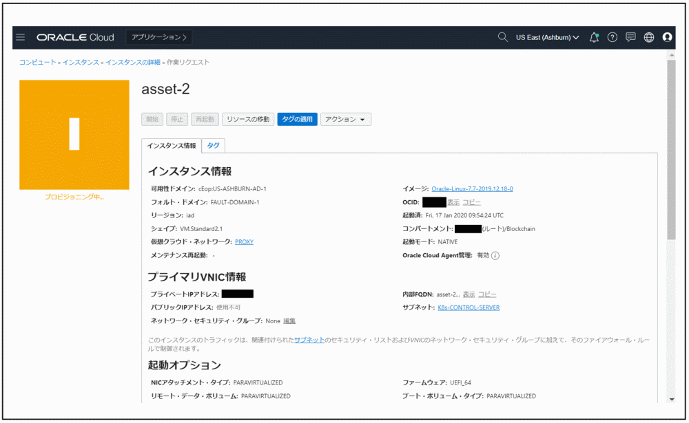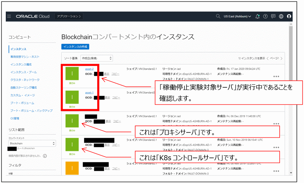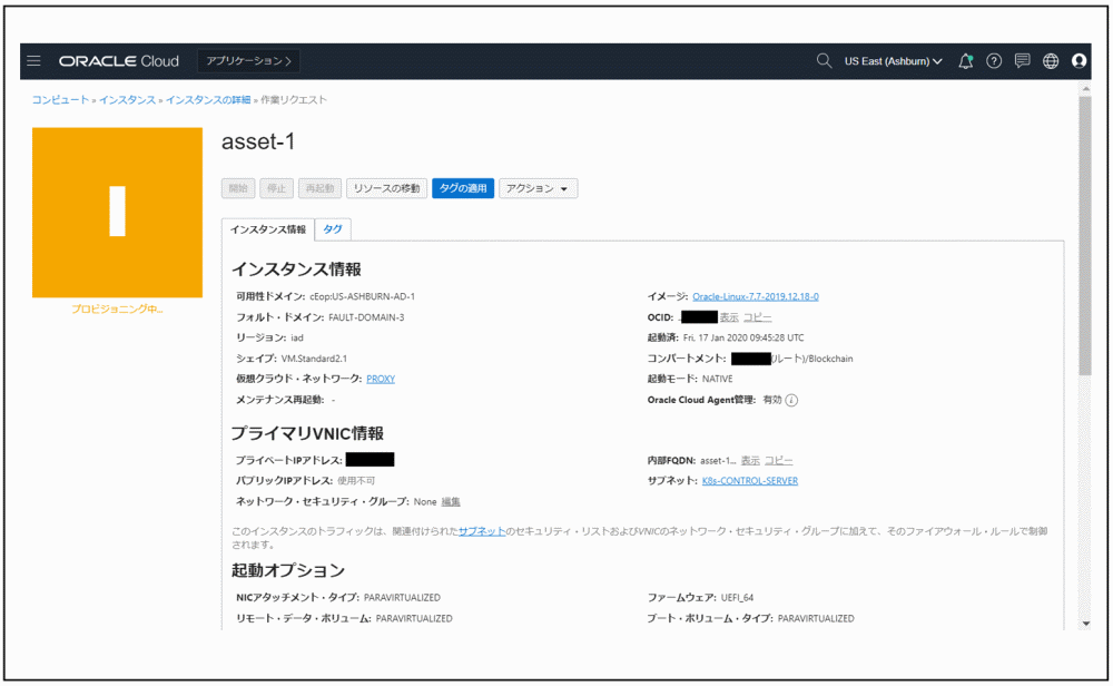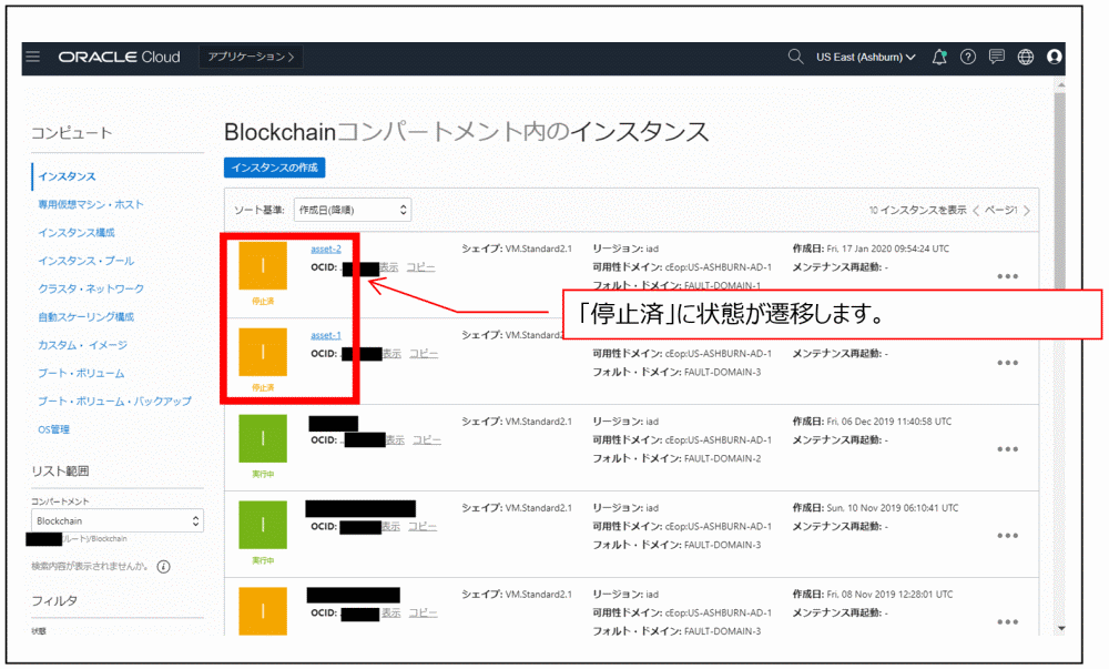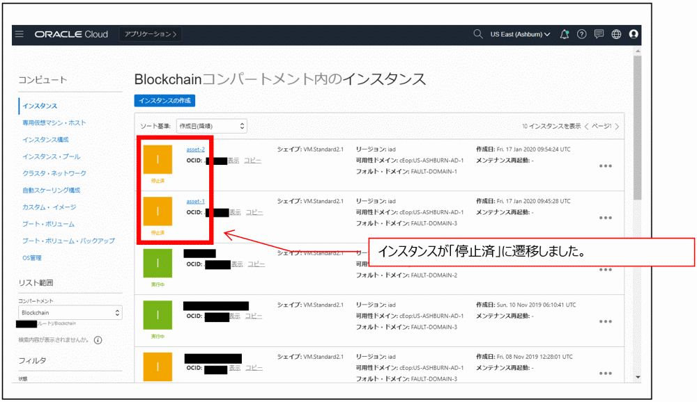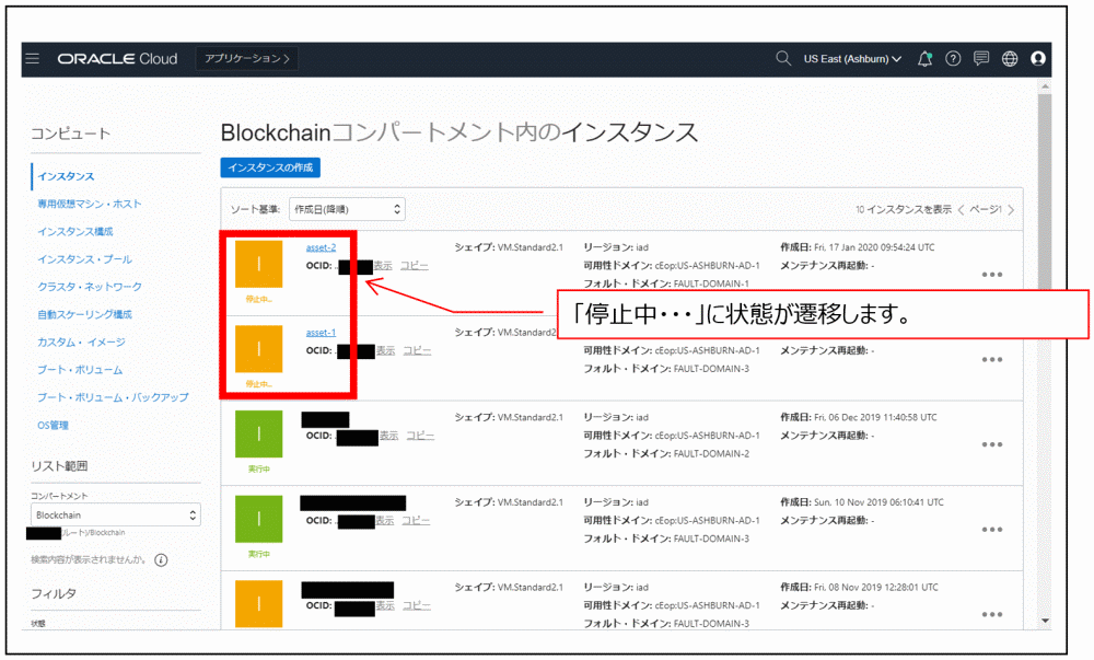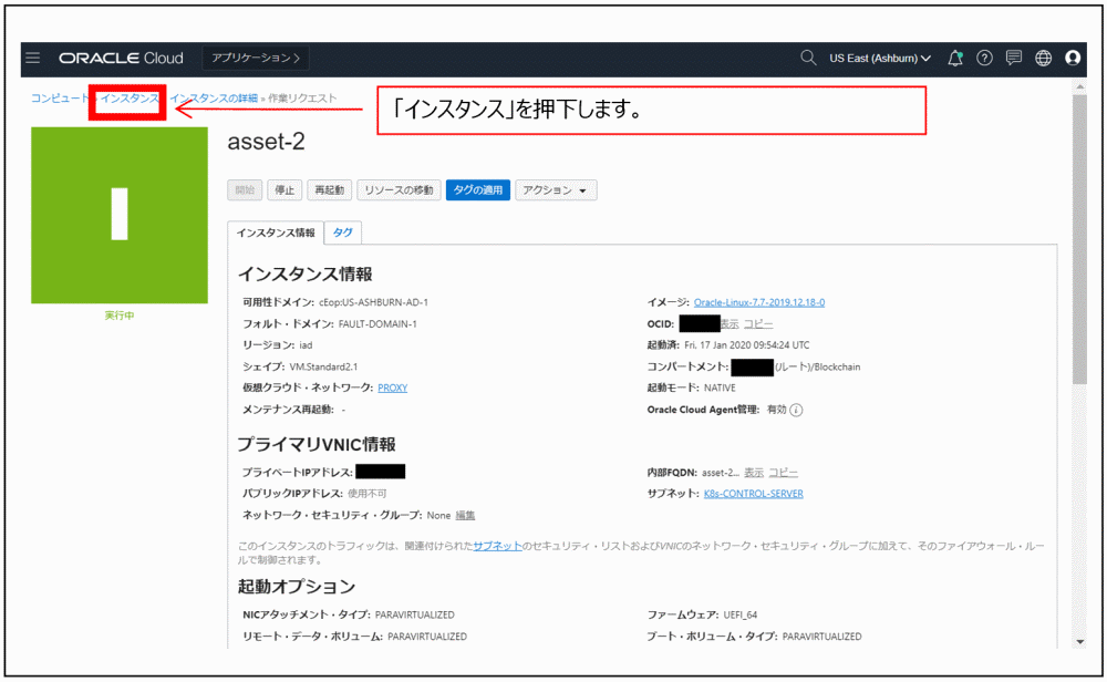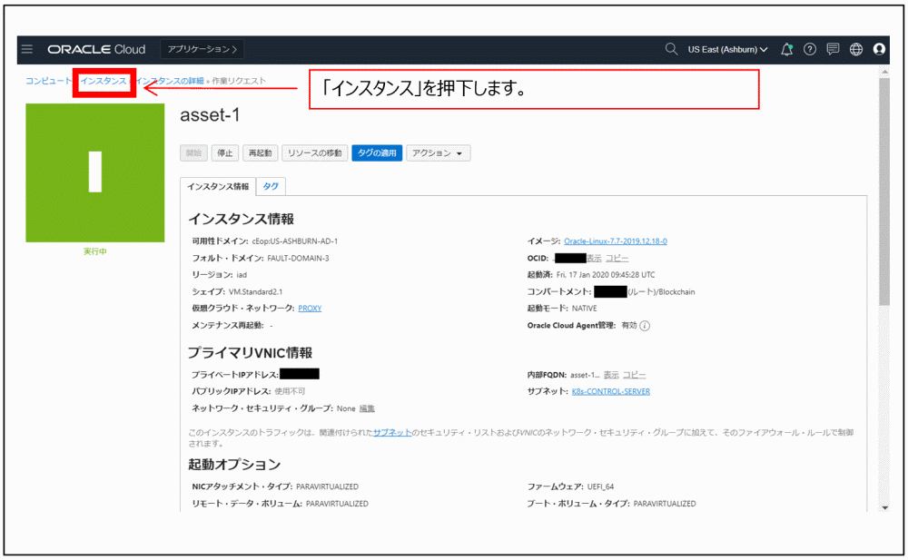 稼働確認は、実際のOracle Cloud管理コンソール上でのインスタンスの状態確認をしながら行いたいと思います。