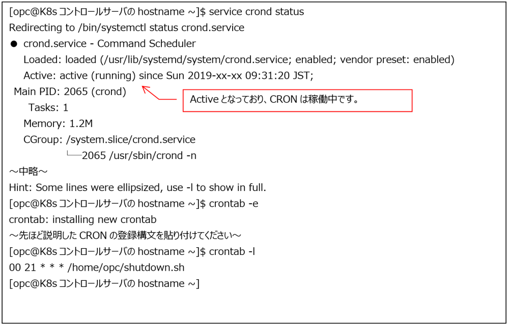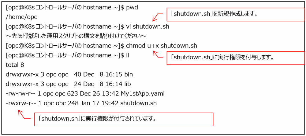 [opc@K8sコントロールサーバのhostname ~]$ ./shutdown.sh