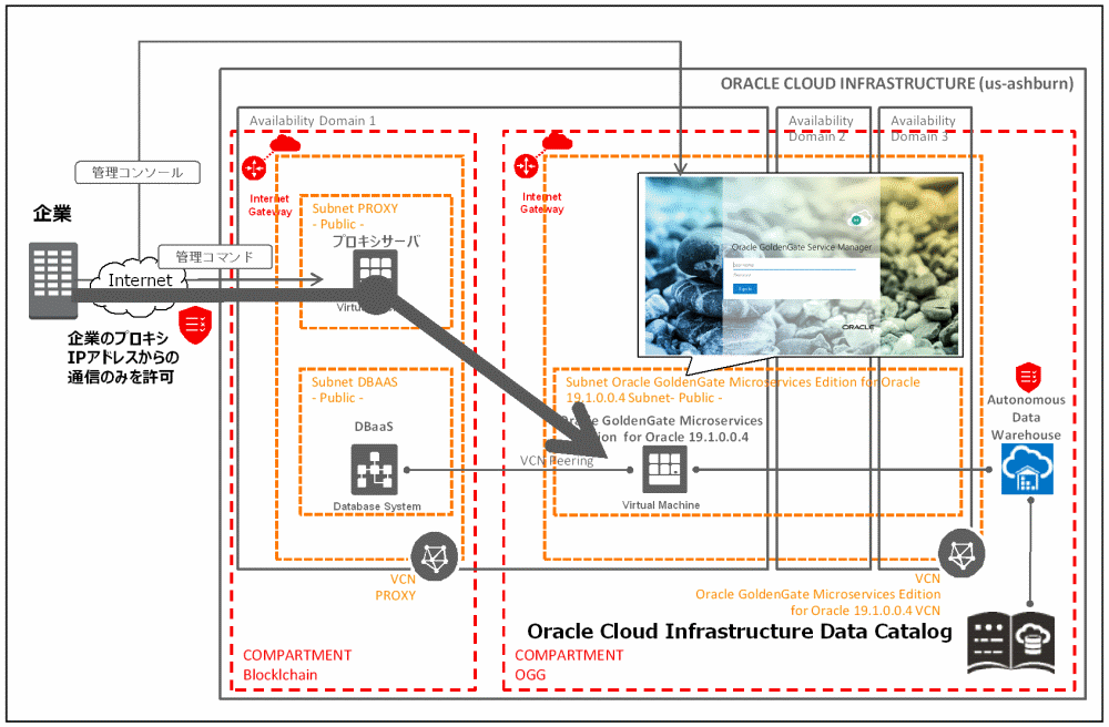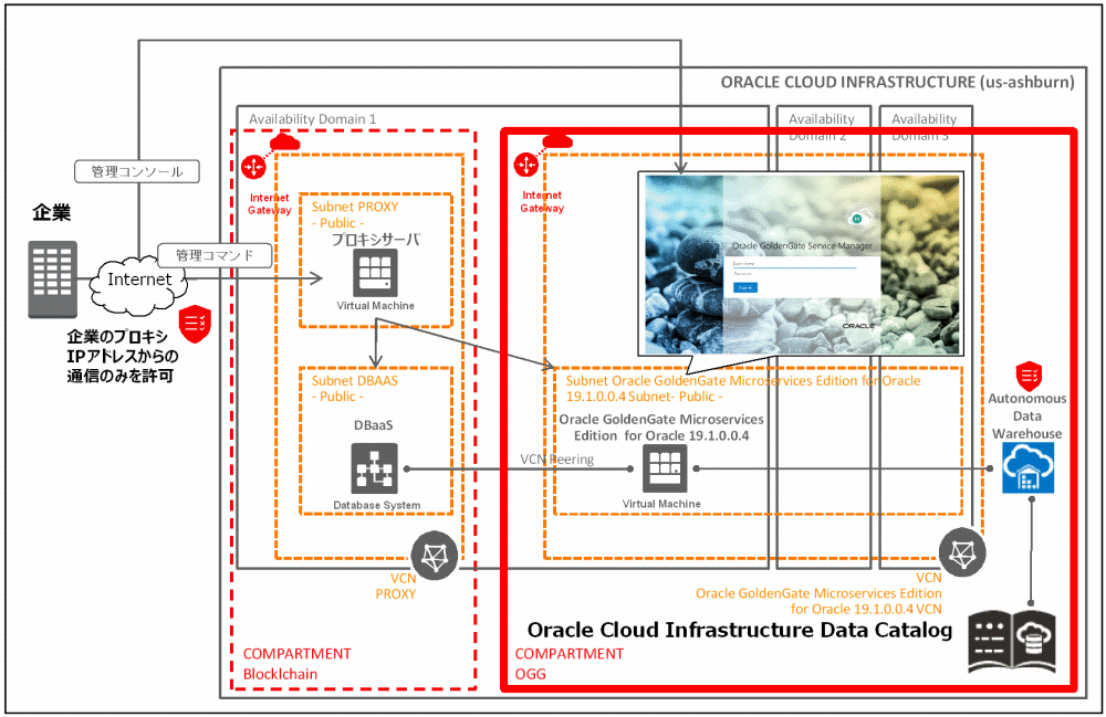 今回実装するのは図中赤枠(COMPARTMENT OGG)内のOracle GoldenGate Microservices Edition for Oracle 19.1.0.0.4 VCNと、(COMPARTMENT Blockchain)のVCN PROXYとのVCNピアリングです。