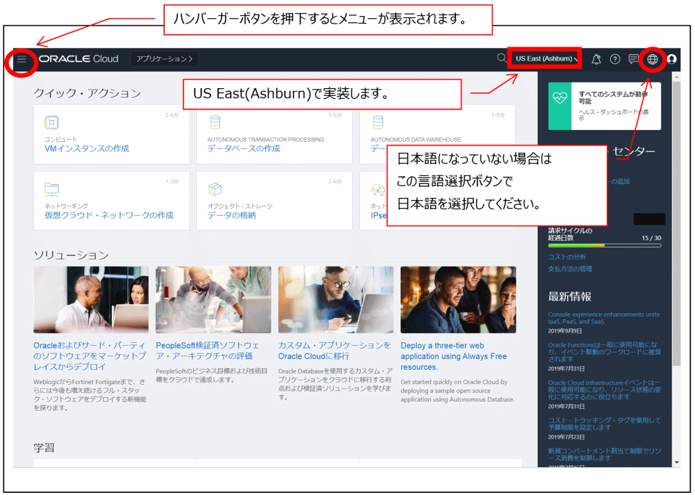 構築開始前にリージョンと、言語の確認をしましょう。必要に応じて、下図を参考に設定を変更してください。