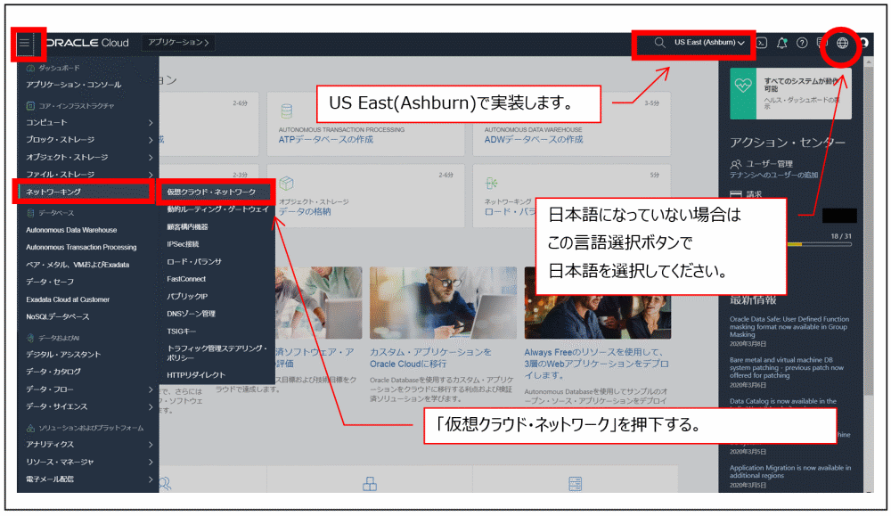 これからOracle Cloud管理コンソールを活用して実装をしていきます。ハンバーガーボタンを押下するとメニューが表示されます。表示されたメニューで構築を進めて行きます。