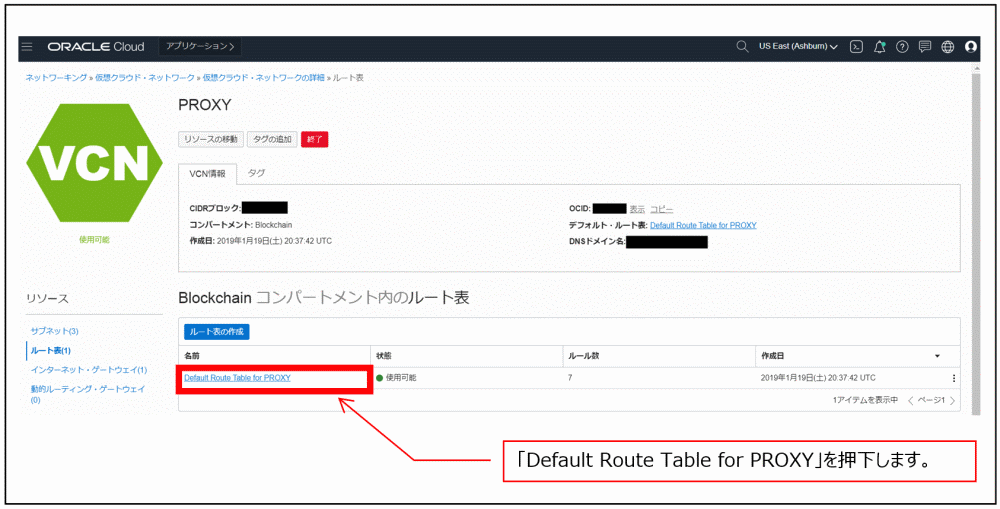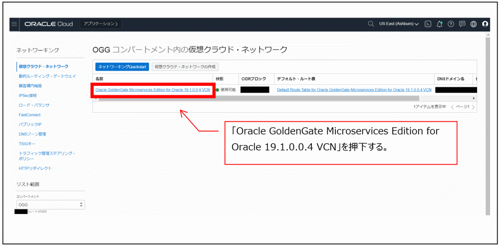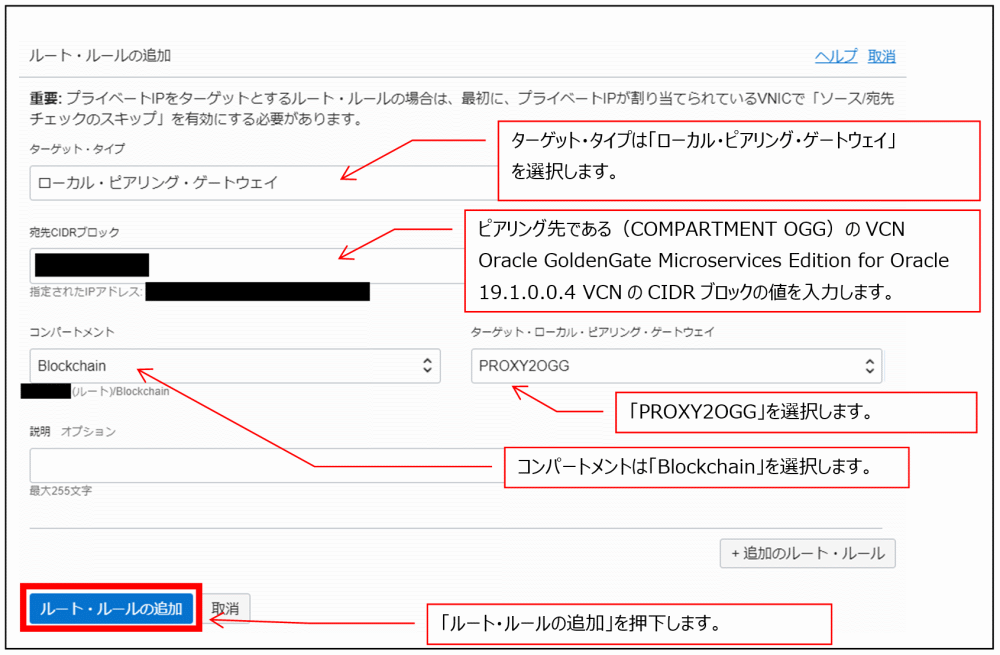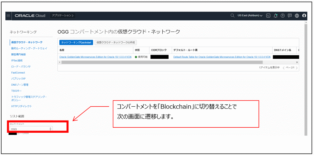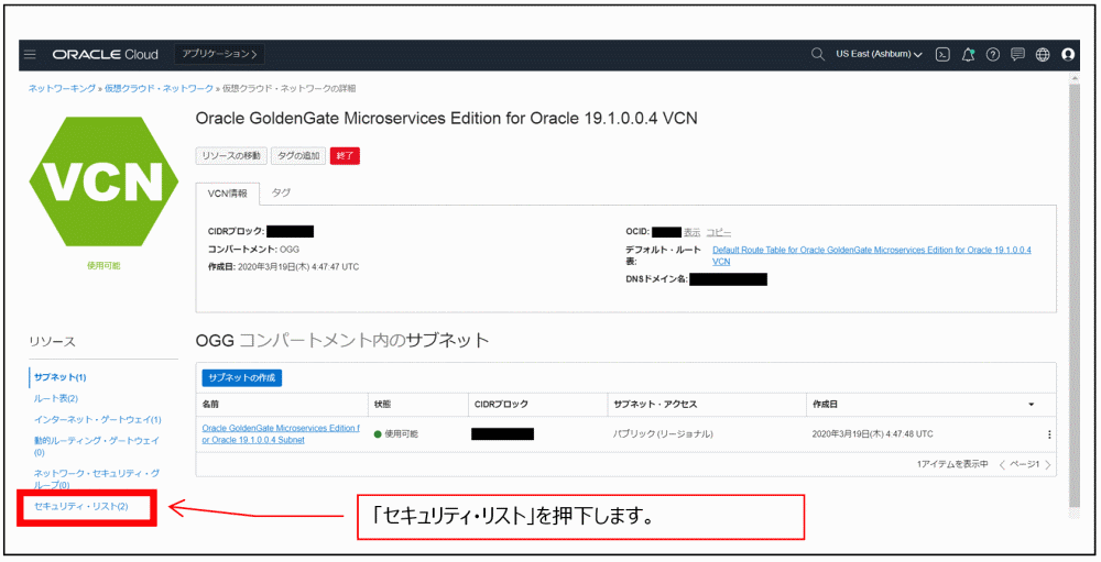 この後の手順でも(COMPARTMENT OGG)内のOracle GoldenGate Microservices Edition for Oracle 19.1.0.0.4 VCNと、(COMPARTMENT Blockchain)のVCN PROXYの設定を交互に行っていきます。