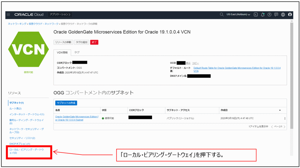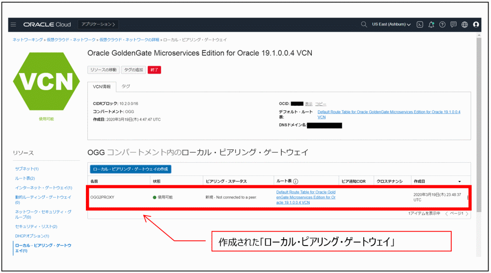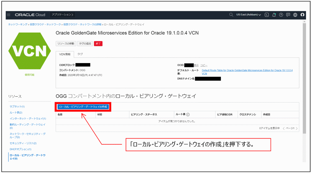 まずは、VCN「Oracle GoldenGate Microservices Edition for Oracle 19.1.0.0.4 VCN」にてローカル・ピアリング・ゲートウェイから作成します。