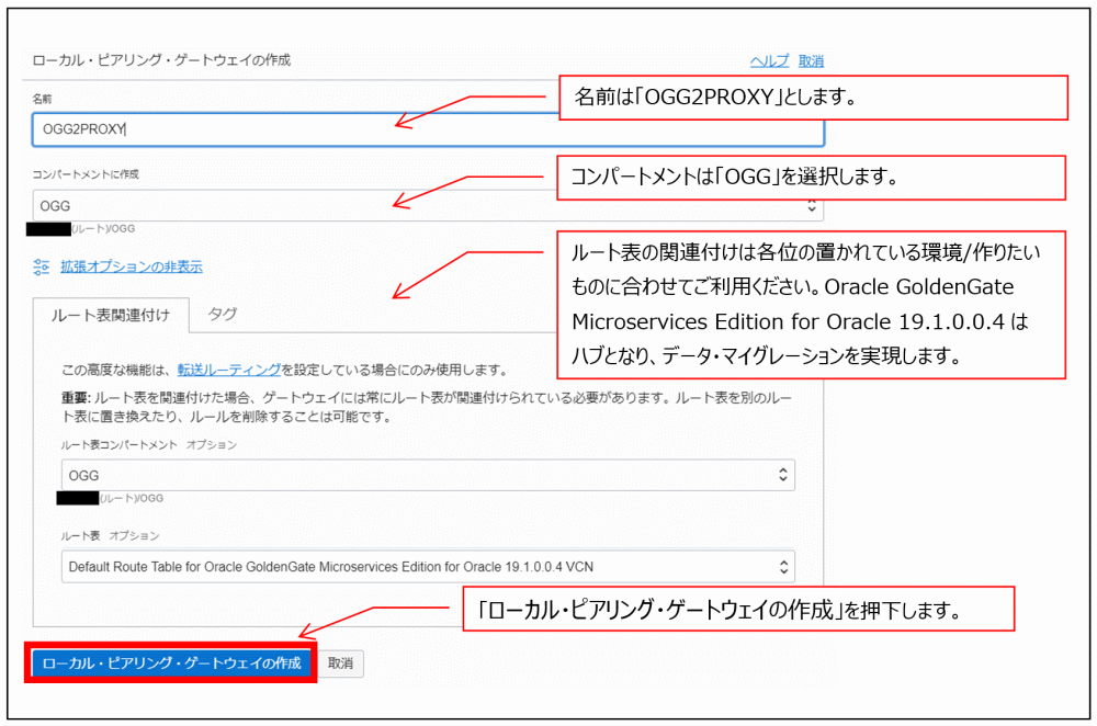 ローカル・ピアリング・ゲートウェイの作成画面において値を入力していきます。
