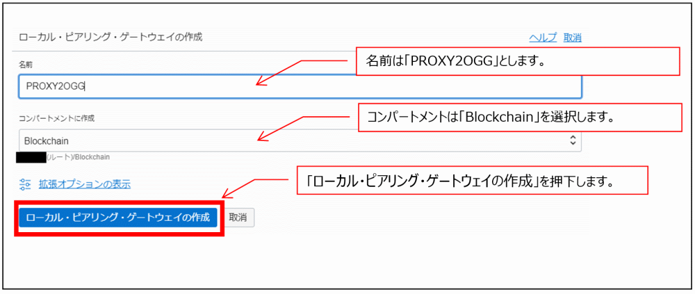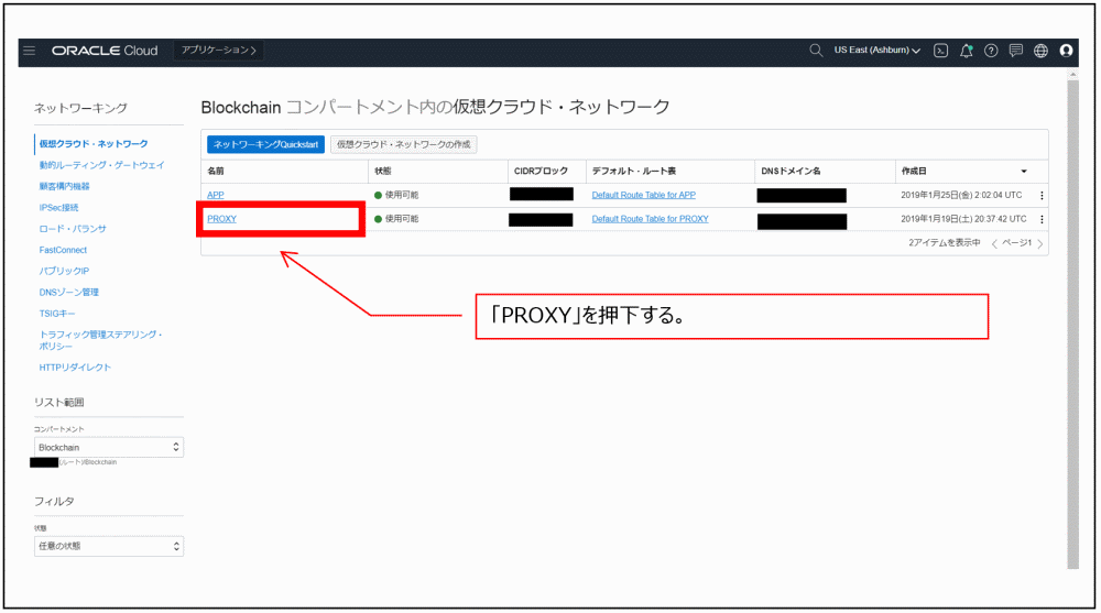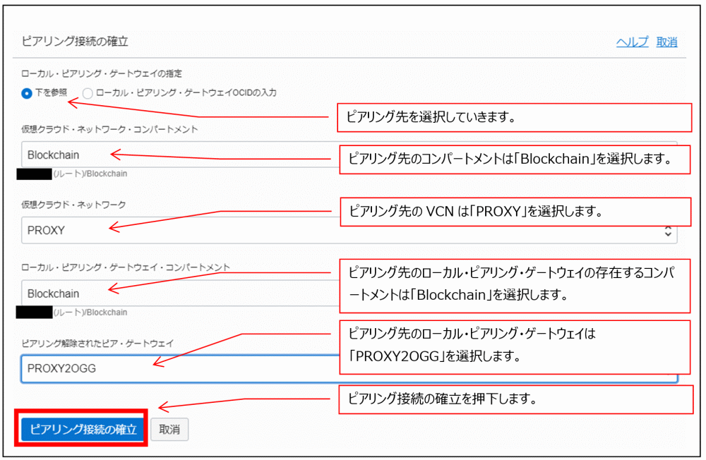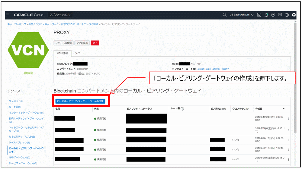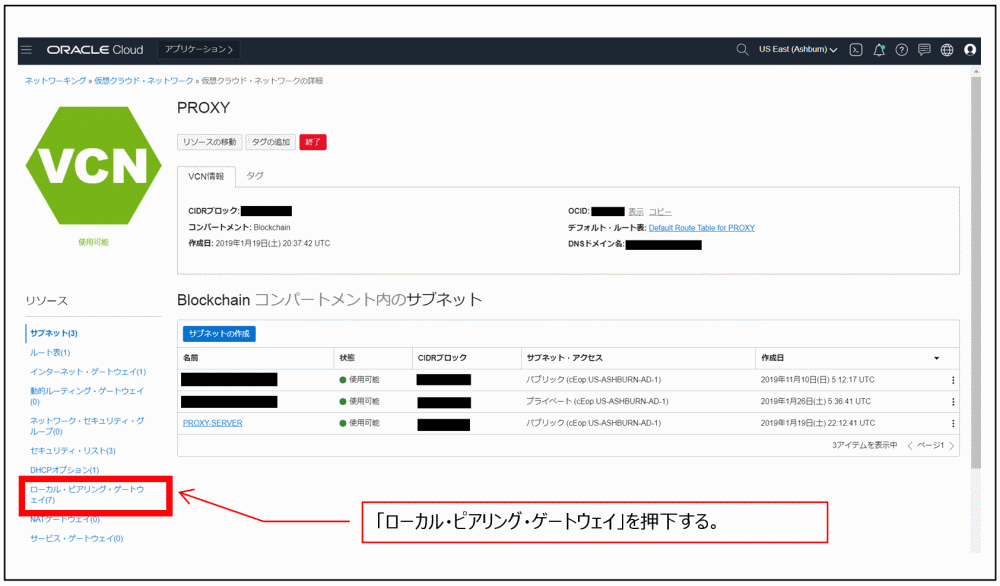 続いて同様の手順で(COMPARTMENT Blockchain)のVCN「PROXY」においてローカル・ピアリング・ゲートウェイを作成します。以下の手順で対象のCOMPARTMENTおよびVCNを切り替えていきます。