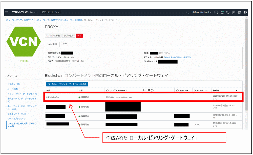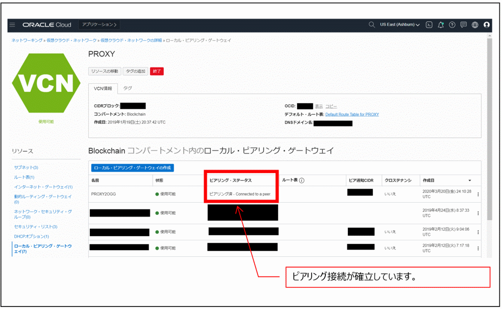 (COMPARTMENT Blockchain)のVCN PROXYに作成したローカル・ピアリング・ゲートウェイの状況を確認してみましょう。下図赤枠のようにピアリング・ステータスが「ピアリング済」となっていれば、成功しています。