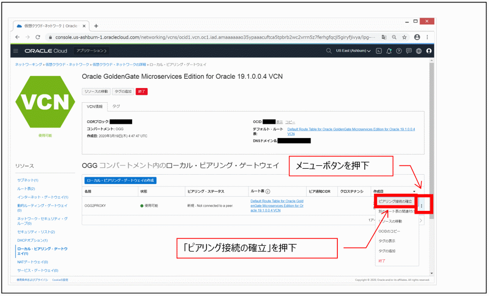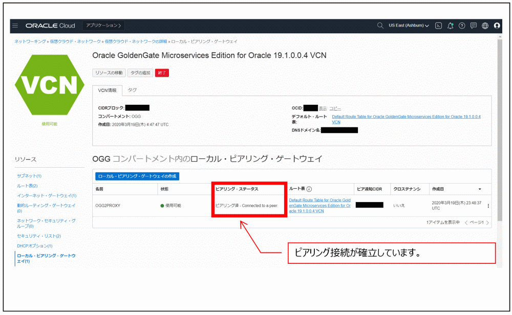 次にピアリング接続の確立をしていきます。今度は(COMPARTMENT OGG)のVCN「Oracle GoldenGate Microservices Edition for Oracle 19.1.0.0.4 VCN」のローカル・ピアリング・ゲートウェイの画面に戻ります。