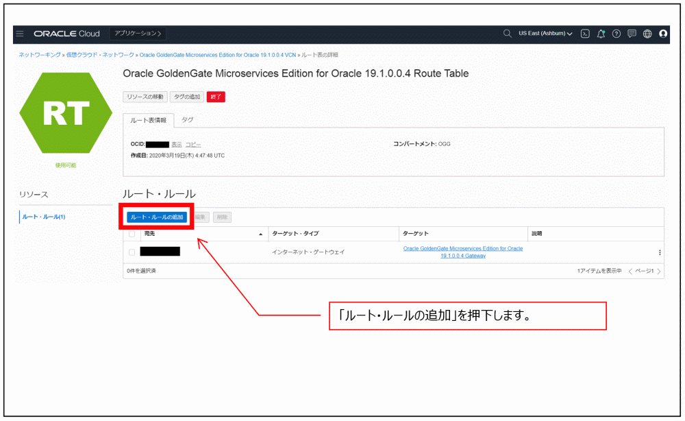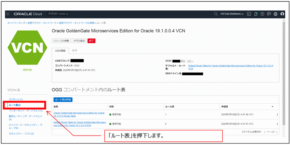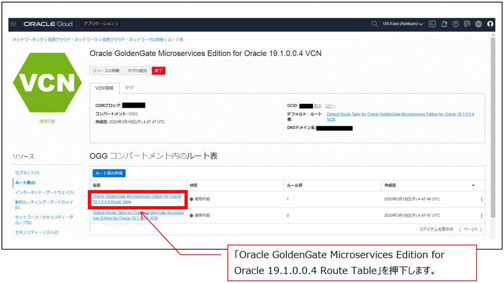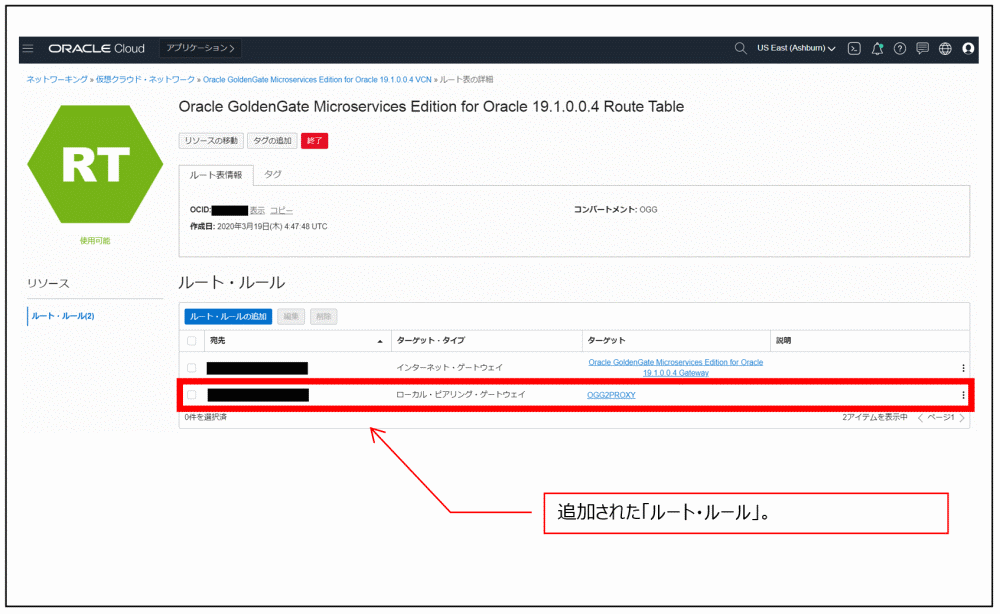 COMPARTMENT OGG)のVCN「Oracle GoldenGate Microservices Edition for Oracle 19.1.0.0.4 VCN」のローカル・ピアリング・ゲートウェイの画面に戻ってから、下図左側赤枠の「ルート表」を押下してください。