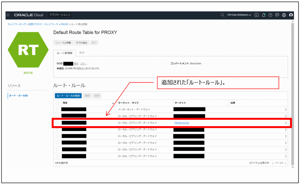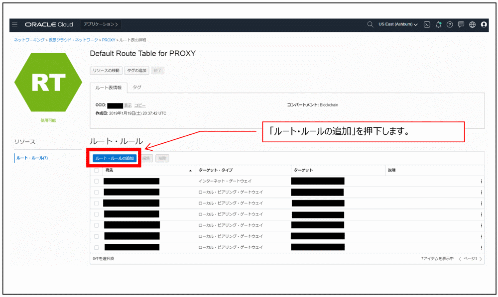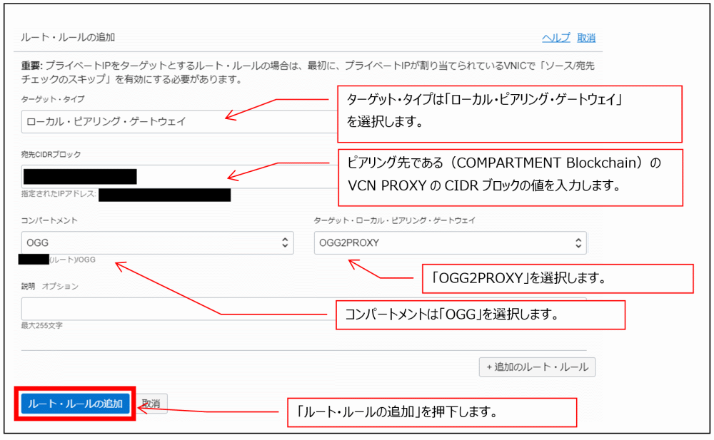 (COMPARTMENT Blockchain)のVCN PROXYにおいても同様にルート・ルールを追加します。