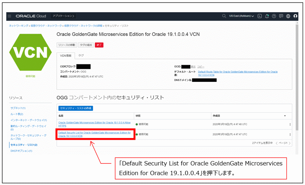「Default Security List for Oracle GoldenGate Microservices Edition for Oracle 19.1.0.0.4」を押下します。