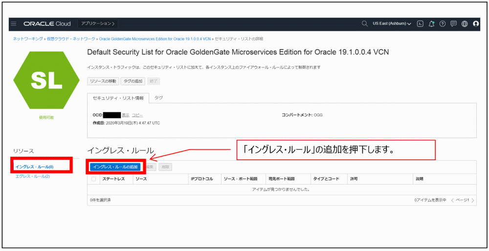 セキュリティ・リストを更新します。(COMPARTMENT OGG)のVCN「Oracle GoldenGate Microservices Edition for Oracle 19.1.0.0.4 VCN」のローカル・ピアリング・ゲートウェイの画面に戻ります。