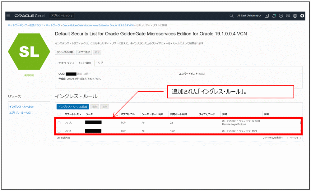 | ソースCIDR | ピアリング先VCN「Oracle GoldenGate Microservices Edition for Oracle 19.1.0.0.4 VCN」のCIDR BLOCK |