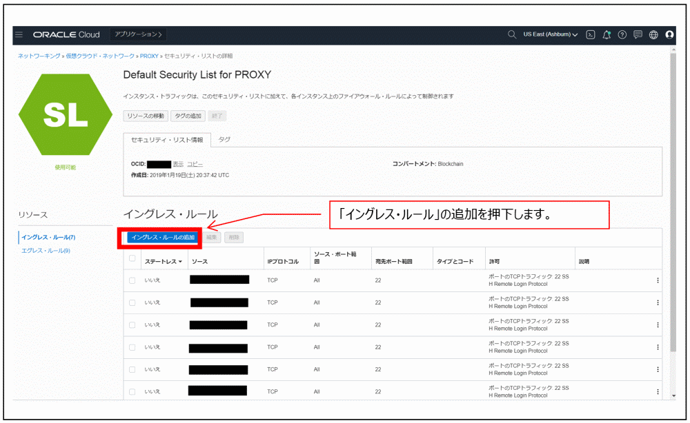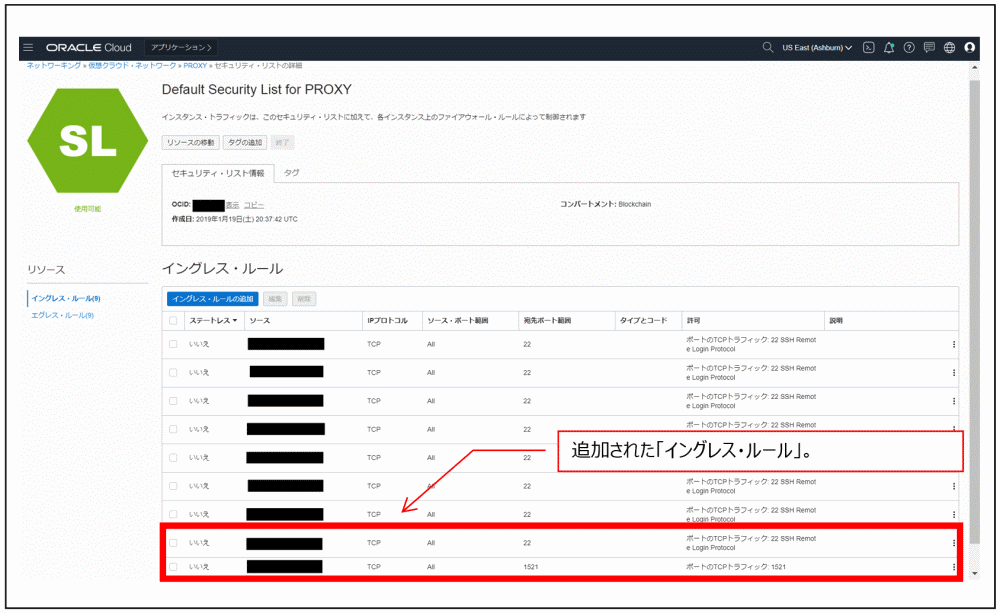 (COMPARTMENT Blockchain)のVCN PROXYにおいても同様のセキュリティ・リストの追加を行います。