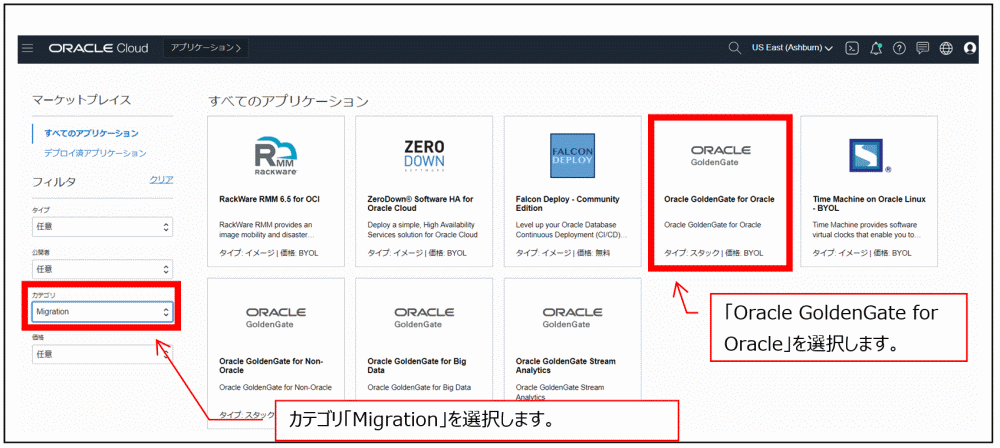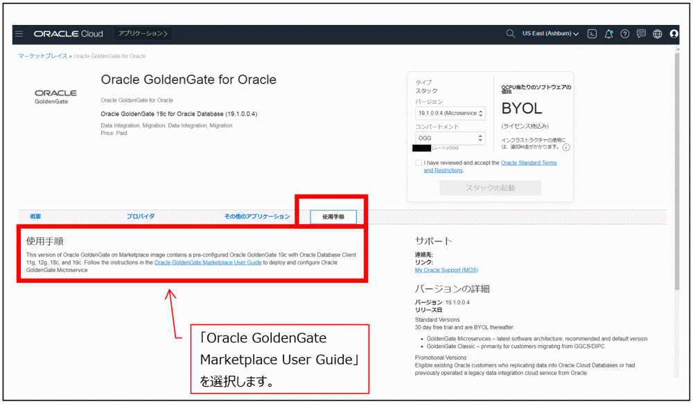 「Oracle GoldenGate Microservices Edition for Oracle 19.1.0.0.4 VCN」を押下して、作成を開始しましょう。