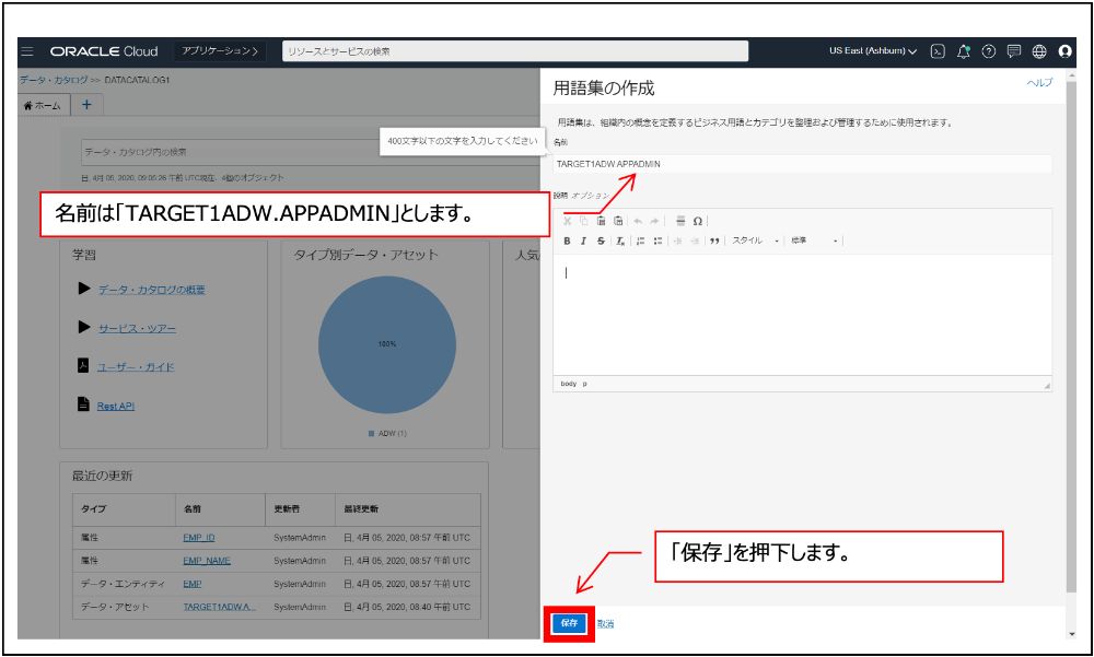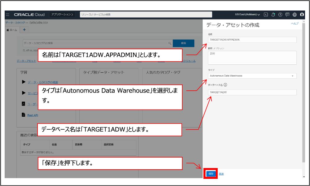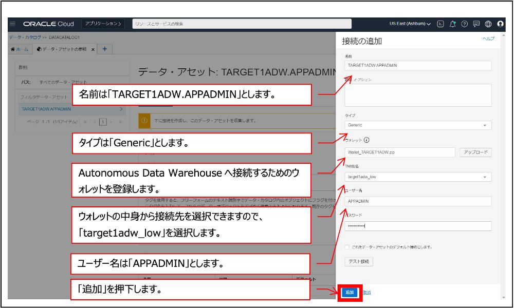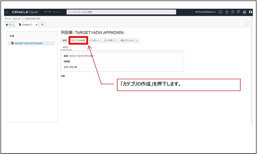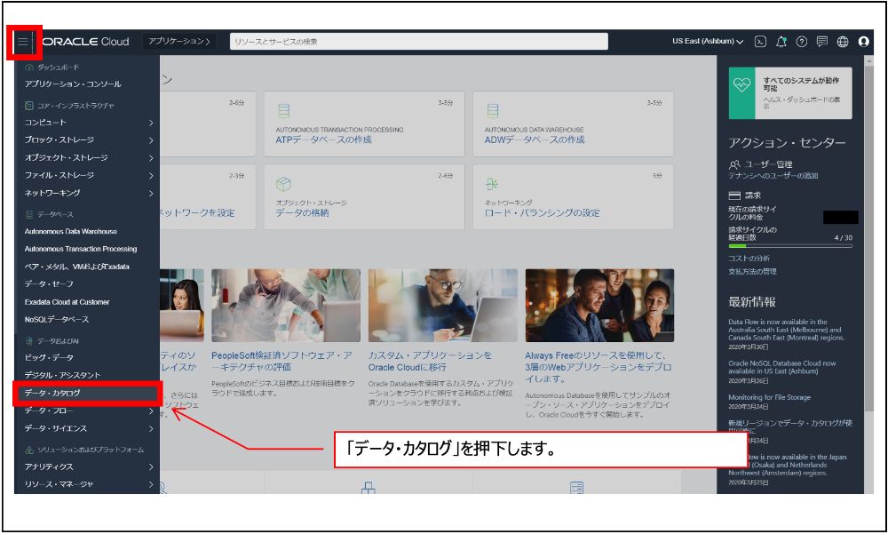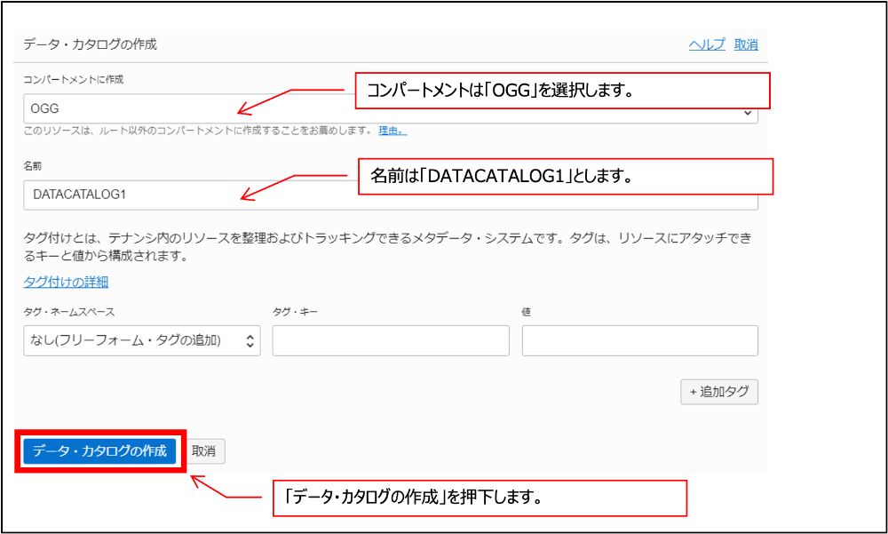 今回整備するのは図中の赤枠、Oracle Cloud Infrastructure Data Catalogと、データ・カタログに登録する情報元であるAutonomous Data Warehouseです。