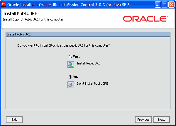 3.In the third installer screen, which you won't see if you install in Linux, you can choose to use the JRockit JVM as the public Java Runtime Environment (JRE) for this computer. This means that whenever a Java program is executed on this machine, it will use JRockit as the JVM.