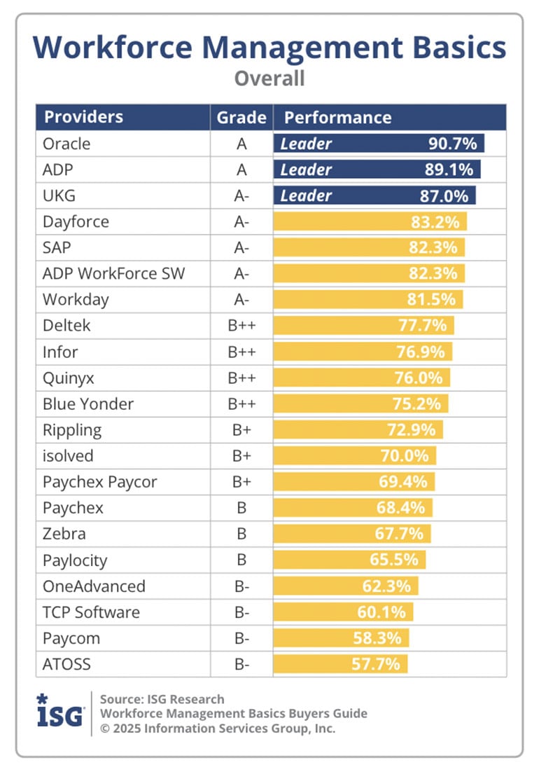 At Oracle, we understand the complexity of this challenge and are committed to helping our customers unlock the full potential of their workforce. That’s why I’m proud to share that Oracle has been recognized as an Overall Leader in the 2025 ISG Buyers Guide™ for Workforce Management Basics.
