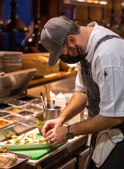 Replacing room service with a takeout model similar to Uber Eats or Grubhub is just one program Pomerville’s team had been keeping on the back burner. But the shifting guest dynamics that COVID-19 brought to Spruce Peak allowed Pomerville to innovate. For example, they put together a market delivery program that offered ready-to-cook meat and seafood and other meal supplies. A family feast program allowed the kitchen to offer a complete dinner for four. The resort also expanded their customer base by making some of these offerings available to communities in the nearby town (while taking care not to compete with local markets and restaurants, which were under stress from the pandemic).