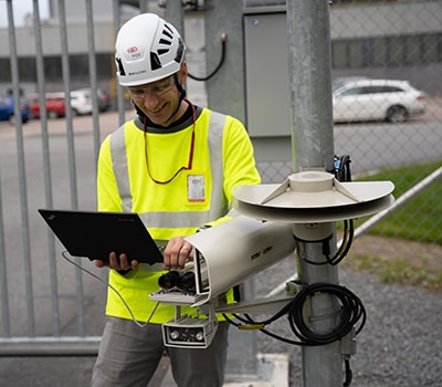 An engineer calibrates a camera that will help automate a gate using Visy’s AI-based vision technology.