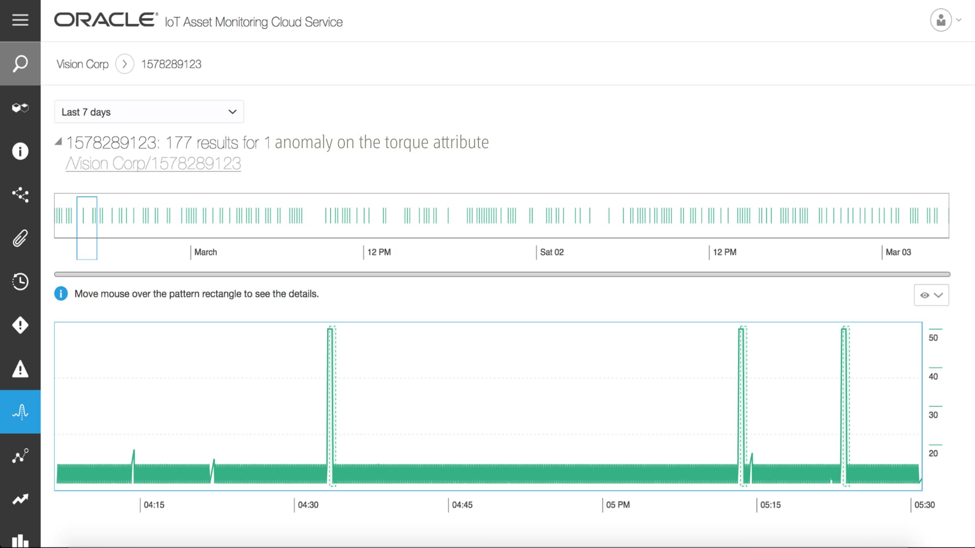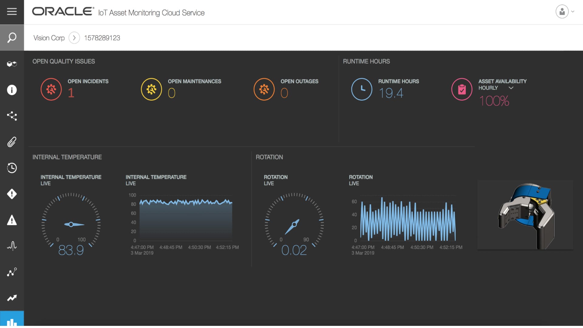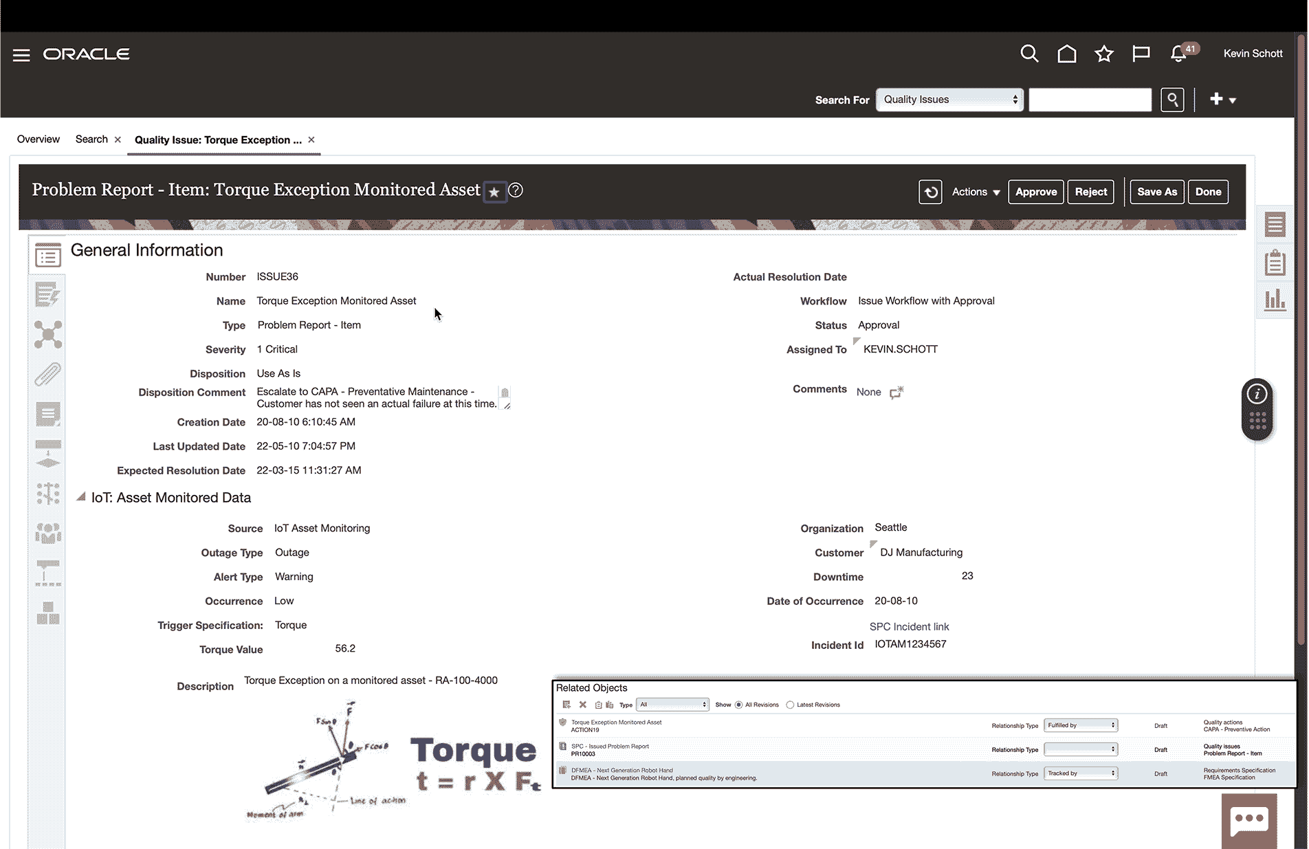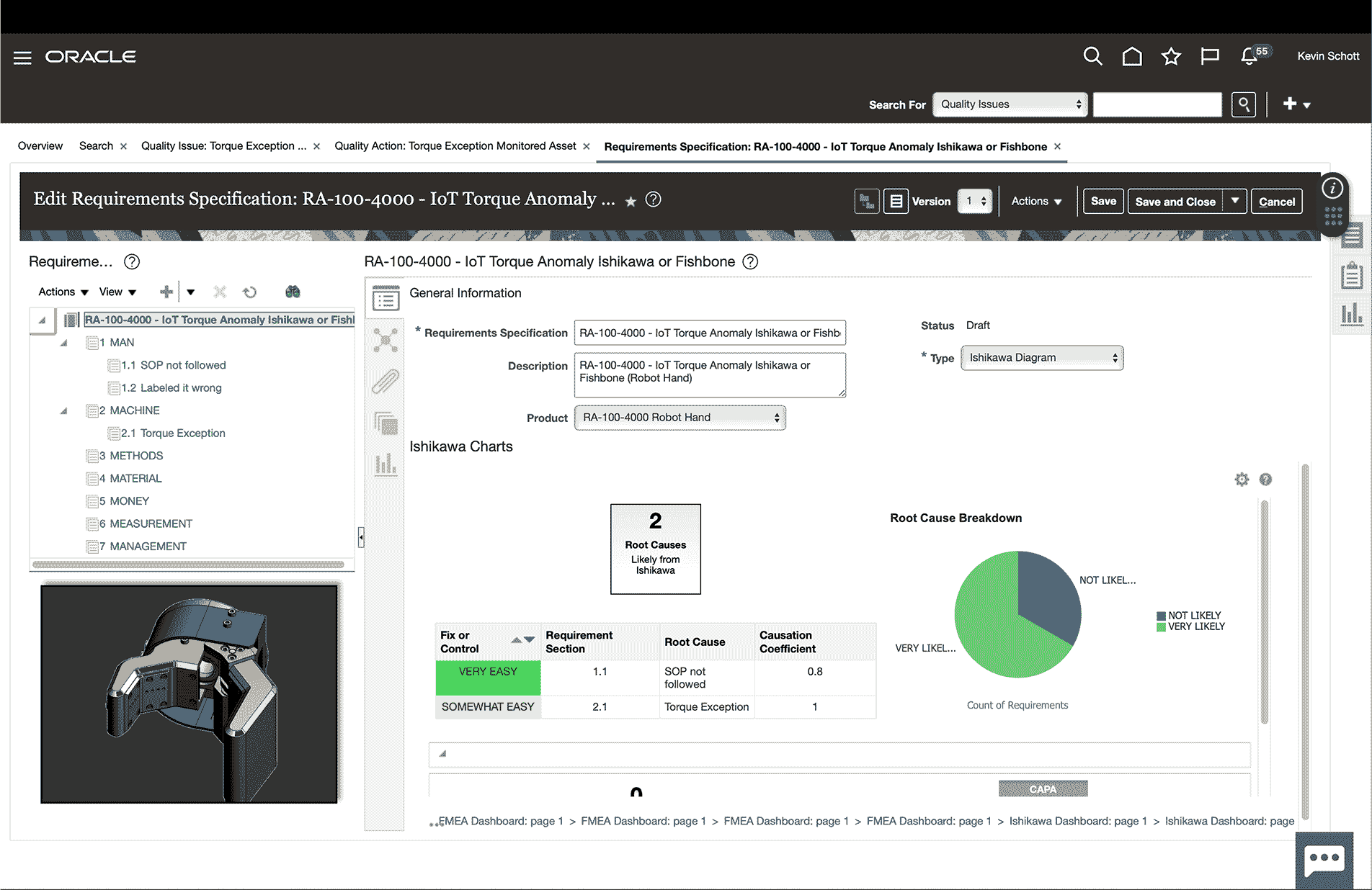 Hier lijkt het erop dat Oracle Fusion Cloud Internet of Things Intelligent Applications een potentieel incident heeft geïdentificeerd dat uw aandacht vereist. Deze robotarm kan een kwaliteitsrisico vormen.
