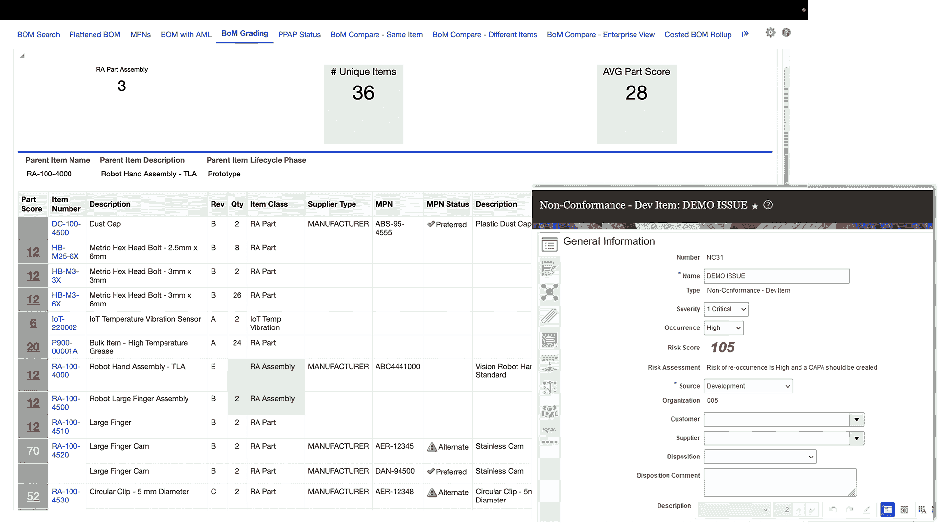 Hier zien we risicoscores die vroeg in de ontwerpcyclus worden gebruikt om onderdelen te selecteren die moeten worden gecontroleerd op mogelijke problemen. Door factoren samen te voegen op basis van kwaliteit, leverancier, inkoop en andere gegevens, helpt de risicoscore bij het bepalen van de waarschijnlijkheid dat het item een probleem veroorzaakt.