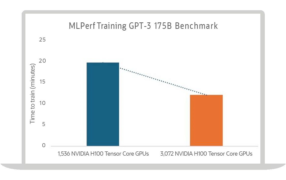GPT-3 175B training: time to train versus number of NVIDIA H100 GPUs deployed in OCI Supercluster (0:55). Source: OCI performance for MLPerf v4.1 training