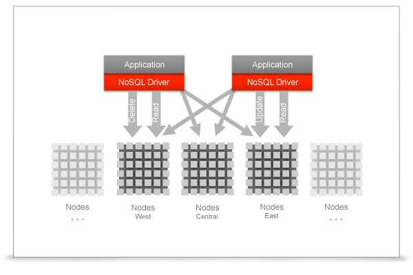 Oracle NoSQL Database scales to hundreds of nodes in multiple data centers.