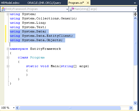 Type the namespace references highlighted in the graphic below. Alternatively, you can copy and paste this information. Open the files folder containing Programcs.txt from your working directory. Then, copy the code including the namespace references and paste them at the top of the Program.cs. These directives allow access to the ADO.NET, Entity Framework and Object Services namespaces. It is not necessary to reference ODP.Net namespaces in this tutorial as ODP.Net is being used indirectly via Entity Framework.